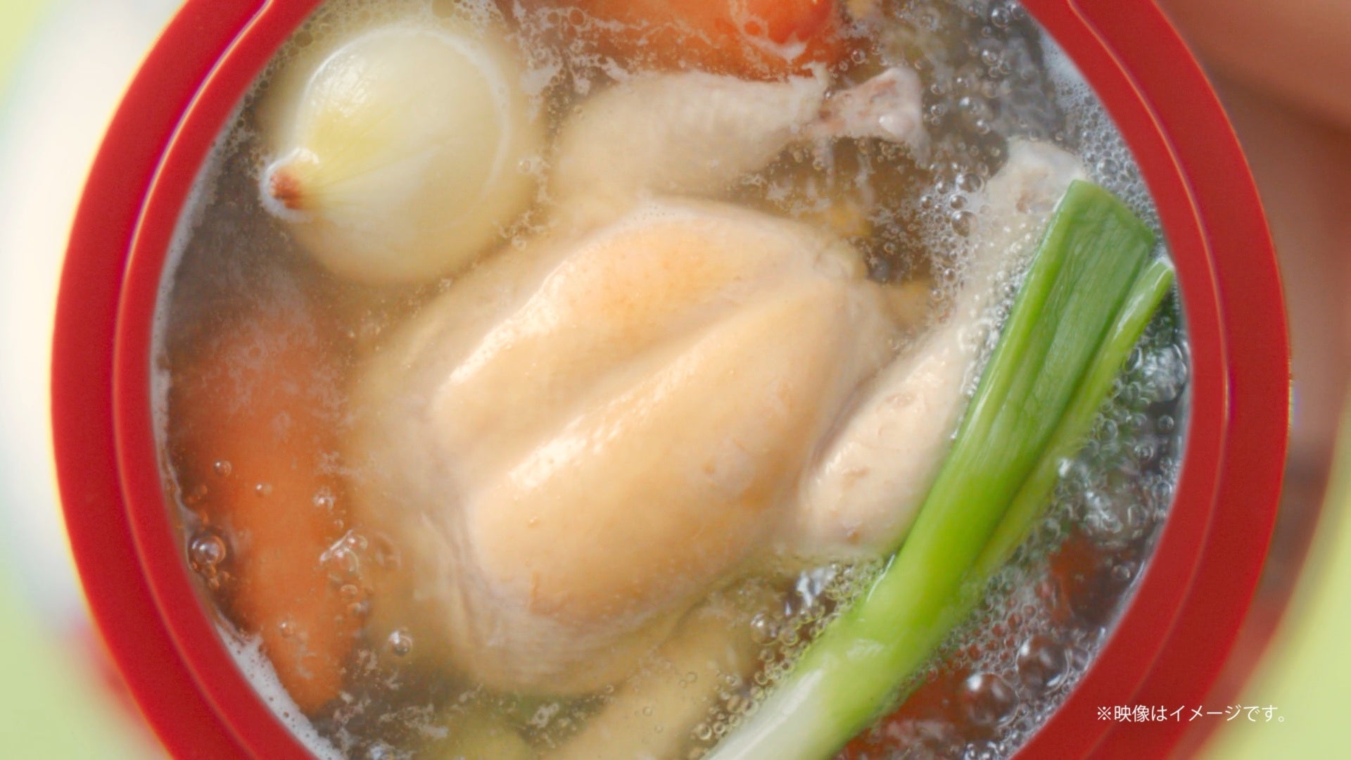 商品を手にした芦田愛菜さんの笑顔で始まる新TVCM。鶏をじっくり煮込んでいる映像や芦田愛菜さんが歌う「丸うた」からは、「丸鶏がらスープ™」には丸鶏ならではのおいしさが凝縮されていることが伝わってきます。