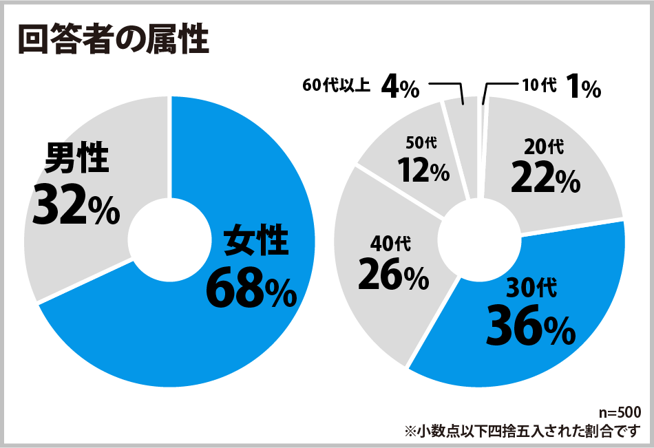 今回のアンケートは男女500人にお聞きしています。性別と年代の内訳は以下の通りです。
