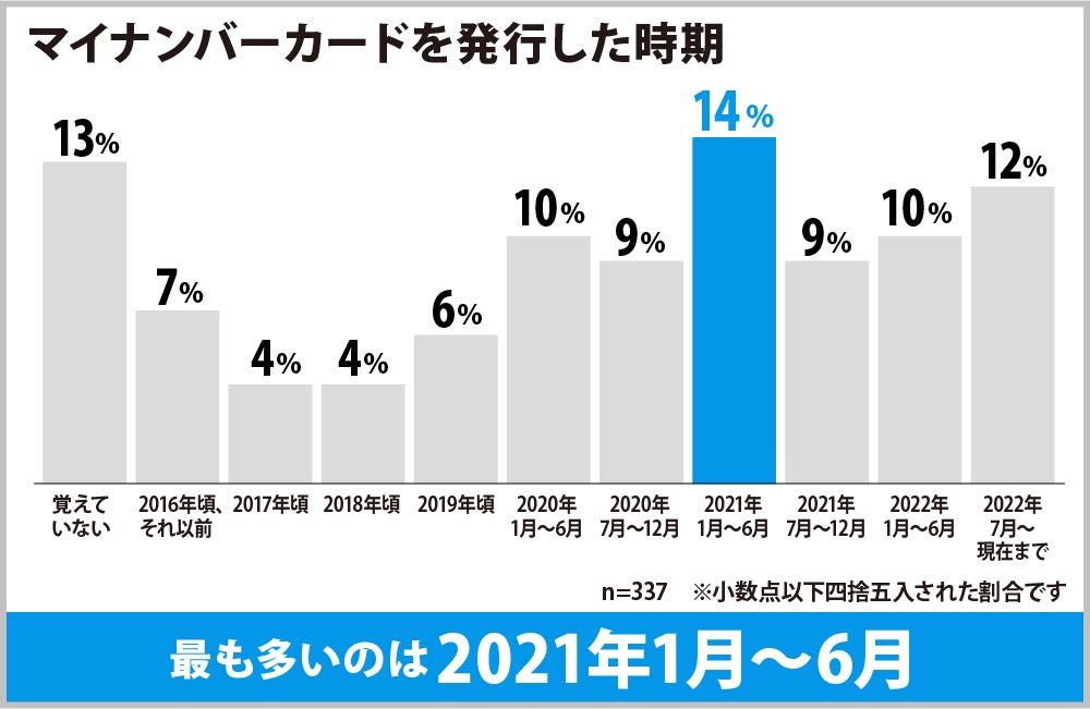 マイナンバーカードを作った時期についても聞いています。始まった当初は少なかったのですが、最初のマイナポイント付与が始まった2020年から増えだしました。