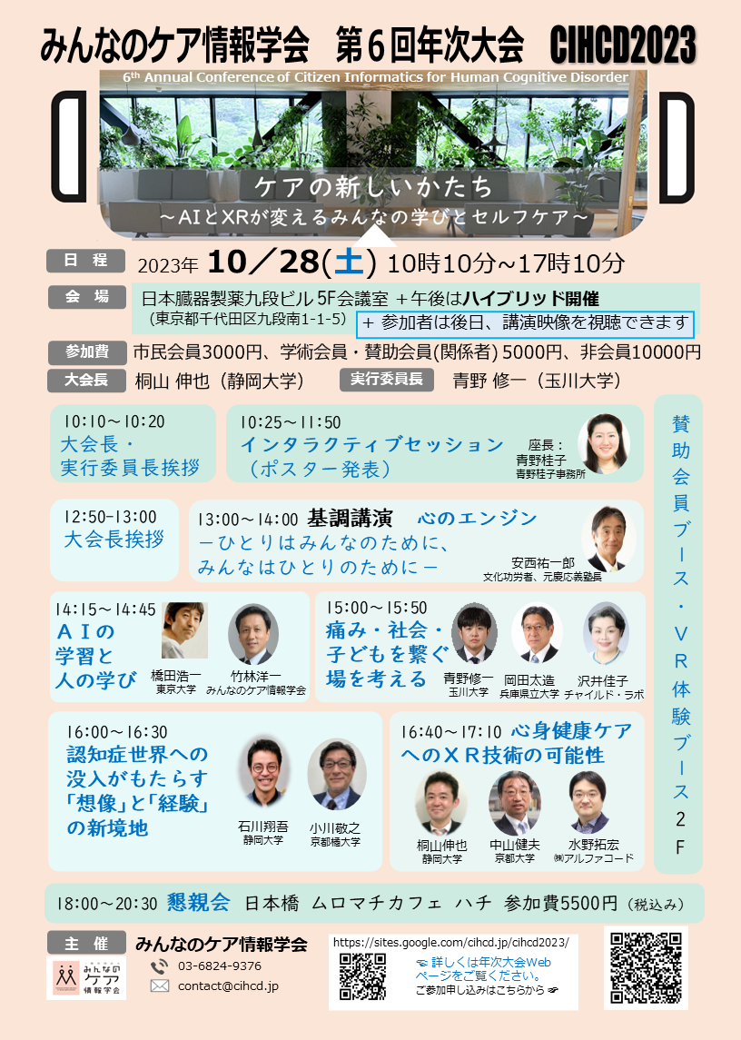 当学会の前身、「みんなの認知症情報学会」は、2017年に設立され、情報学をはじめ多領域の専門家が集い、認知症当事者や介護現場の関係者を交えて、「ごちゃまぜ」で情報と意見を交換する、ユニークな学会イベントを創り上げてきました。認知症当事者の声と地域のケアに関する要望に耳を傾けながら、認知症ケア、介護者の学びの支援、専門的な知識を気軽に学べるプラットフォームづくり、等々に関する研究と社会的実践に取り組み、学術集会である年次大会は、市民が本格的な議論に参加できる場として定評を得てきました。そして2023年、「みんなの認知症情報学会」は、「みんなのケア情報学会」と改名し、認知症のみならず、人間の子ども期から高齢期に至る 生涯発達をケアの対象として、一人ひとりの市民の個性やニーズに寄り添った「ケア」と「学び」を提供するための研究と実践をめざします。とりわけ多元的AIとXR技術を利活用したイノベーションによって、「ケア」の質を高め、多世代の「学び」を身近にするプラットフォームを構築することは、少子高齢化や単身世帯の孤立が加速的に進むコミュニティーにおいて、喫緊の課題です。「みんなの認知症情報学会」が築いた市民参加型の年次大会を、新しい「みんなのケア情報学会」は受け継ぎ、本大会も誰でも参加できる学会イベントとして開催します。今回は、「ケアの新しいかたち」を テーマに掲げ、一人ひとりが充実した人生を送るための「セルフケア」と、それを支える「学び」について、みんなで議論し交流する場を、対面とオンラインのハイブリッドで設け、自由闊達なインタラクションが期待されます。