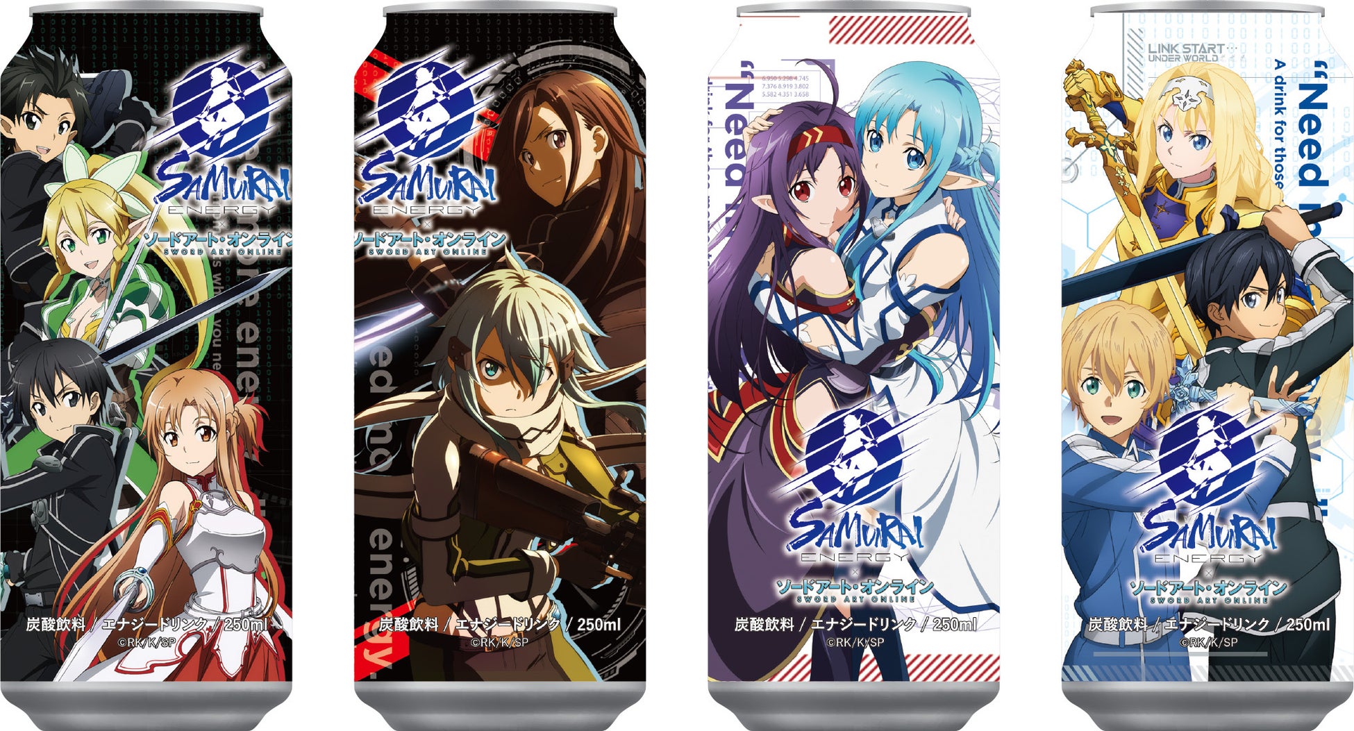キリト、アスナ、リーファ、シノン、ユウキ、ユージオ、アリスの7人が登場する限定コラボ缶4種類が登場!(250ml・190円(税抜))
