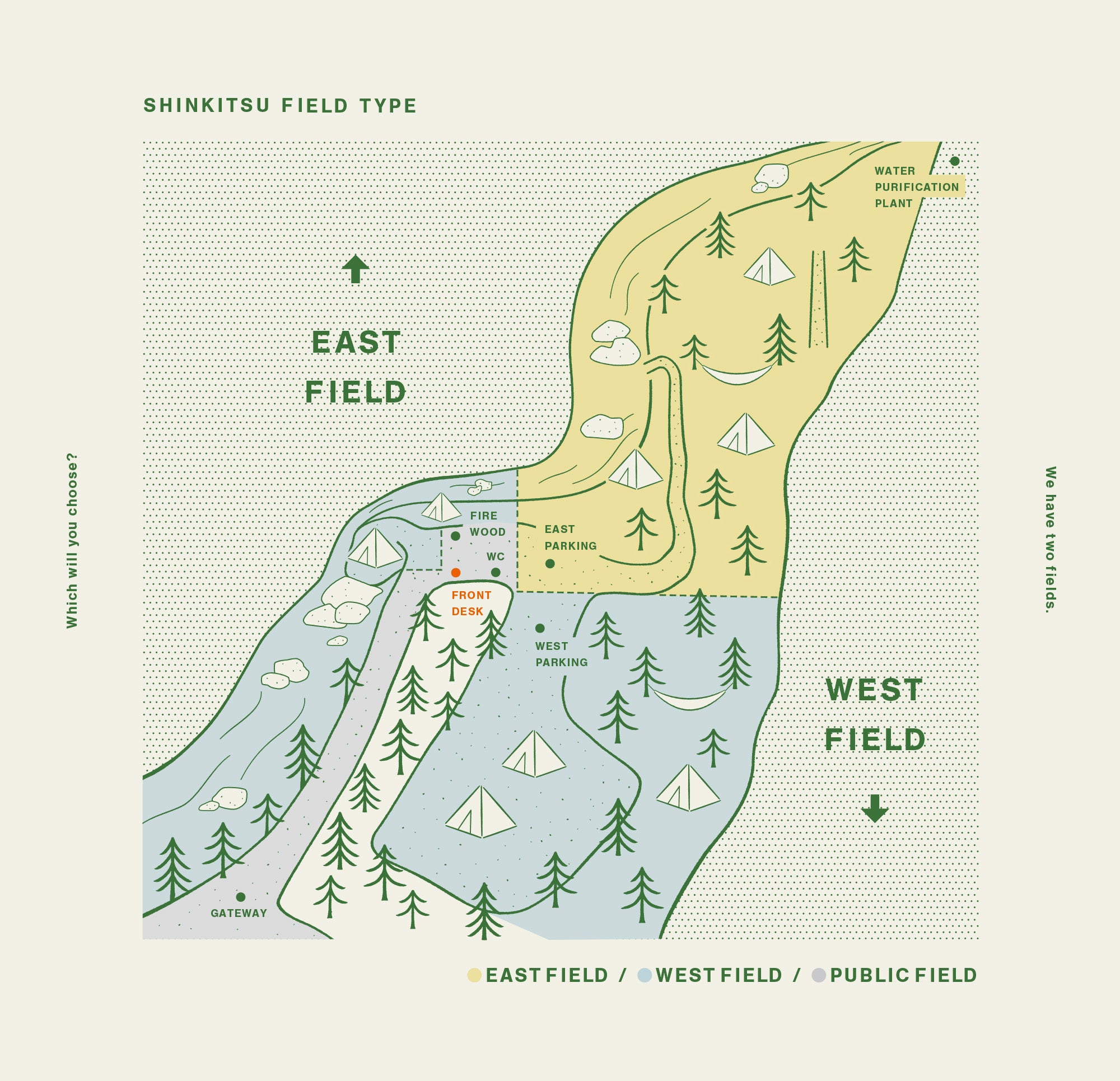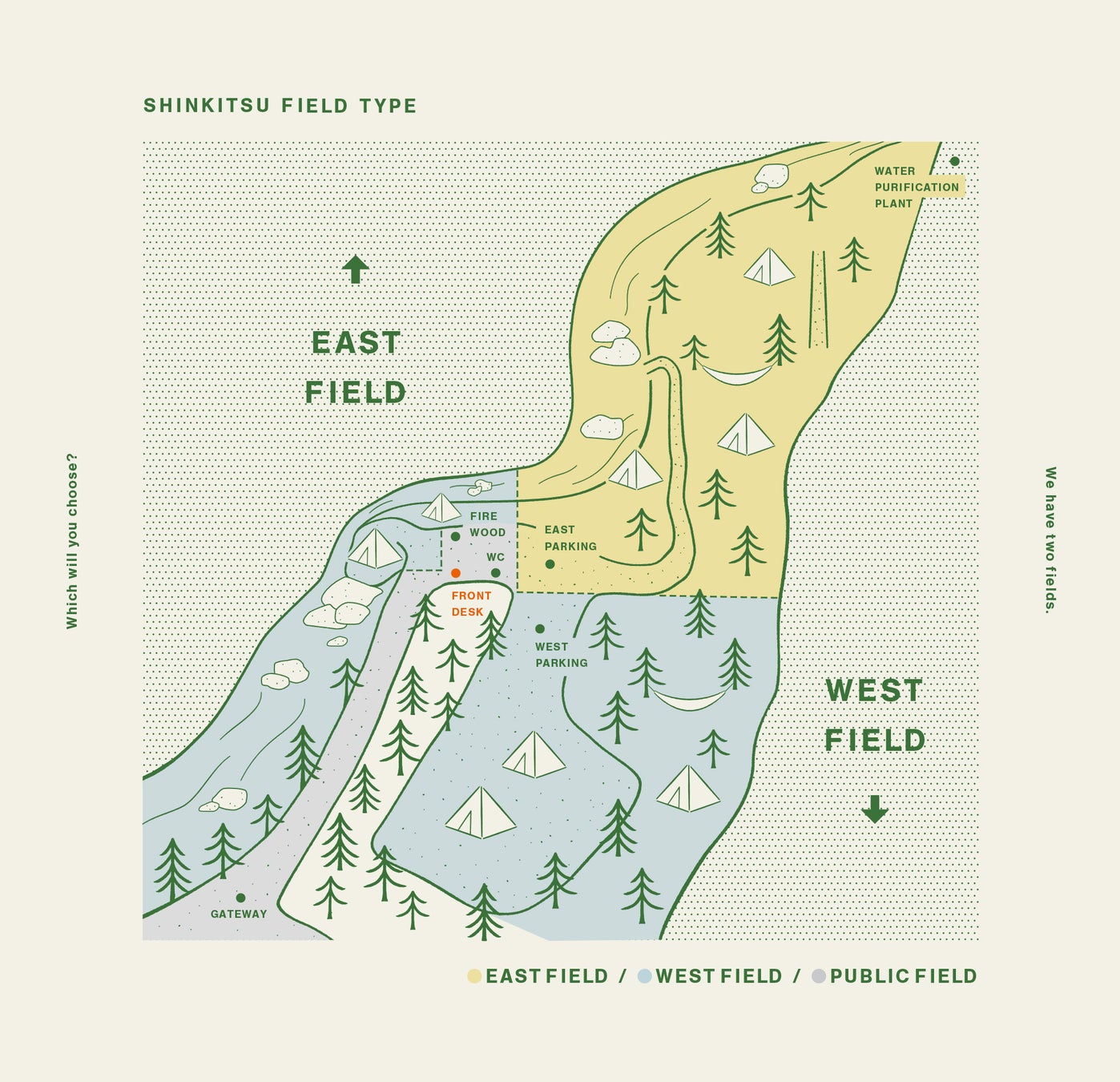 森喫(しんきつ)は「EAST field」「WEST field」と二つのエリアに分かれ、それぞれ1日1組限定での利用ができるプライベートフォレストです。