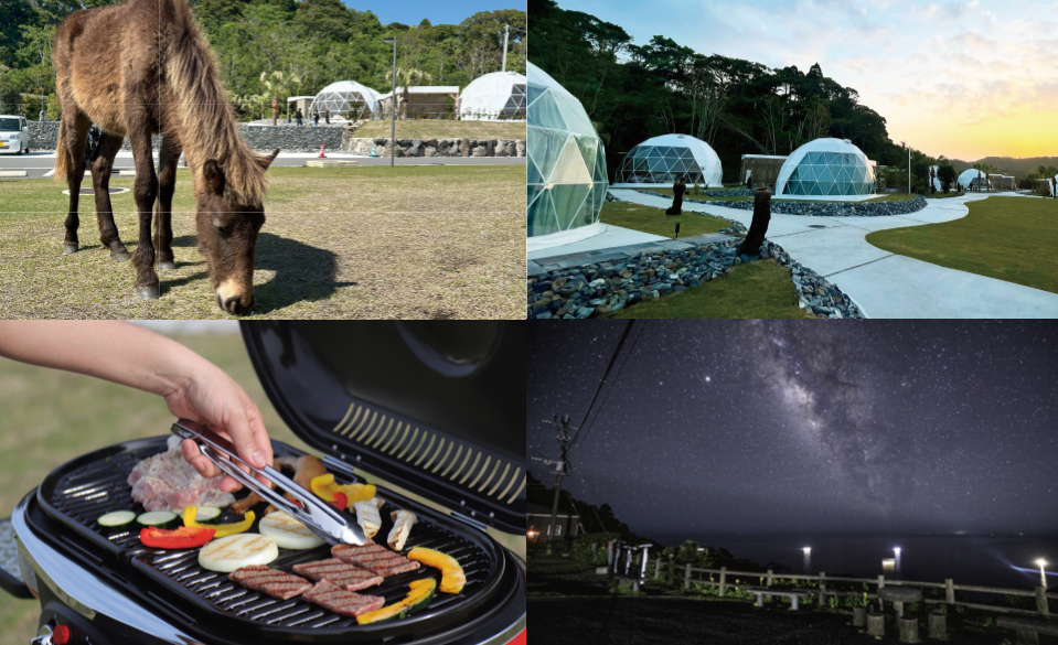 「トイグラン ソラシタ」は、宮崎県串間市とも連携、野生馬が暮らす宮崎県の景勝地「都井岬(といみさき)」の国定公園で、実際に「トイグランソラシタ」の目の前を野生馬が通り過ぎるなど、ナイトサファリさながらの感動を体験しながら、贅沢な滞在をお楽しみいただけるグランピング施設です。また、宮崎牛や地元のブランド豚、宮崎県のブランド鶏である地頭鶏が楽しめるバーベキュー場やシャワー施設も完備しており、グランピング初心者にも気軽に楽しめるようになっております。さらに、周辺では天の川が眺められる天然のプラネタリウムが楽しめたり、周辺の道の駅など一帯を楽しめたりと、南国宮崎を満喫できます。夏休みの思い出作りに、家族との新しい体験に、「トイグラン ソラシタ」は、新しい価値を提供していきます。