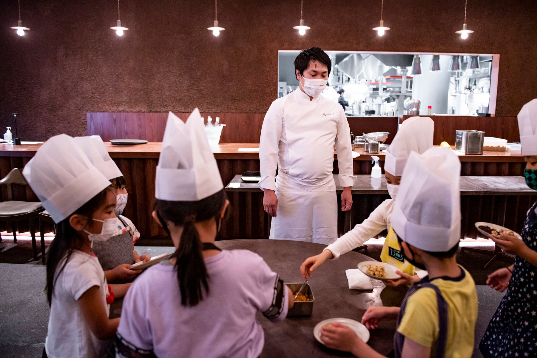 第三弾の heeee !イベントでも前回に引き続きひとり親世帯を中心とした子どものいる困窮家庭に向けた食品支援「WeSupport Family※」への寄付を行う。その一環として 今回は「WeSupport Family」の支援先のご家庭を招待し、信太シェフによる料理教室を開催する。料理教室では日本の家庭料理の基本となるメニューをシェフから学んでもらい、料理完成後には保護者とテーブルを囲み召し上がって頂く時間を用意した。