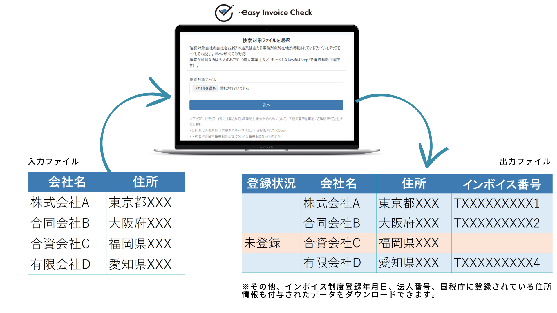 チェック結果はCSVデータ出力が可能となっています。当該出力データには、アップロードされた取引先情報に加えて、インボイス番号(適格請求書発行事業者番号)、登録年月日、法人番号、国税庁に登録されている住所情報が追記されるので取引先の情報を整理することが可能です。