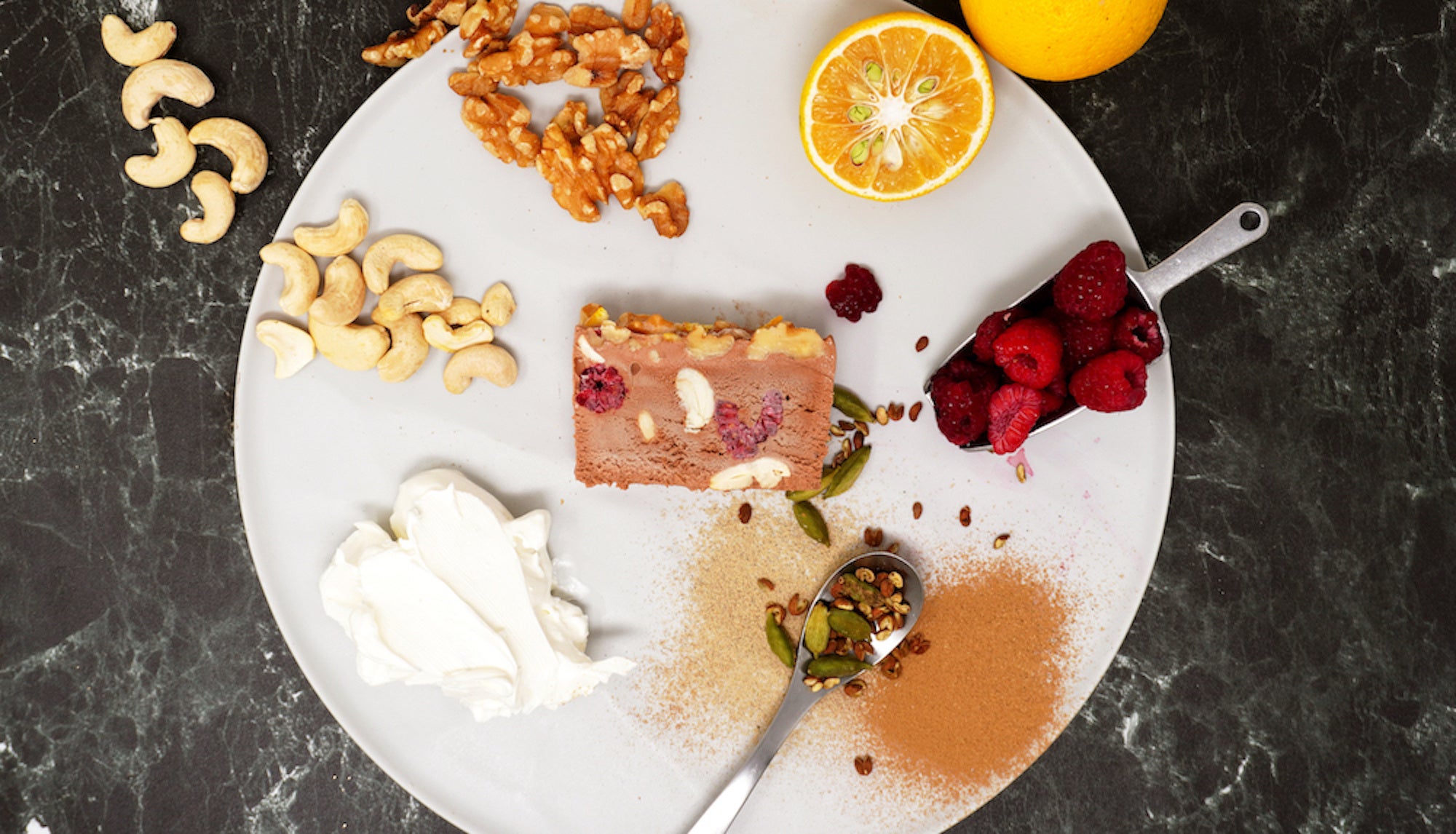 原材料|生クリーム、ラズベリー、カシューナッツ、クルミ、ビターチョコレート、クレームショコラ、クレームスクレット、濃厚クリームチーズ、グラニュー糖、柚子皮(国産)、山椒、カルダモン