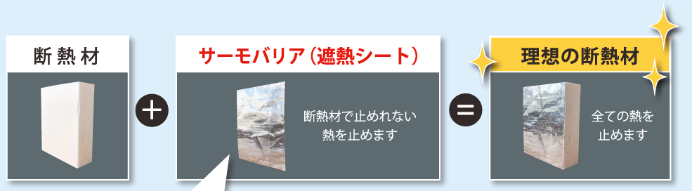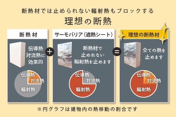 そこで遮熱シートを施工する時には、伝導熱、対流熱を抑える働きを持つ断熱材を併用することで、すべての熱を抑える「理想の断熱」が実現します。