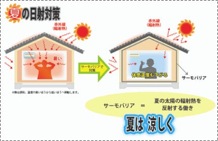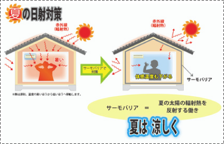 サーモバリアには、日光などの輻射熱を反射し輻射熱が室内へ入るのを防ぐ効果があります。サーモバリアを住宅などの屋根や壁に使用することで、夏は日射による輻射熱を室外側へ反射させ、建物の温度上昇を抑え、体感温度を下げることができます。