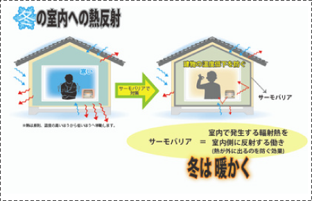 また、サーモバリアは放射率が低いことから、物体から放出される熱を抑える(=閉じ込める)特性があります。輻射熱の放射性が低いことで、輻射熱が室外へ逃げるのを防ぎ、効率よく室内を保温することが可能です。間も無く冬を迎えますが、これからの時期の「室内の寒さ対策」にサーモバリアは非常に有効です。