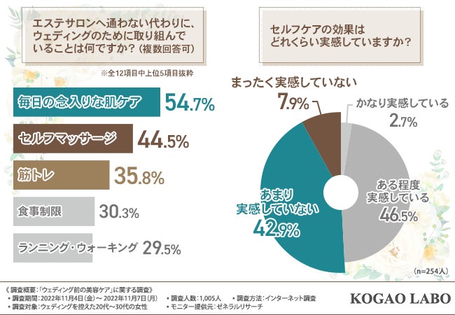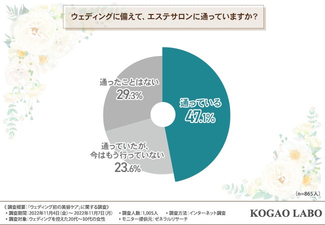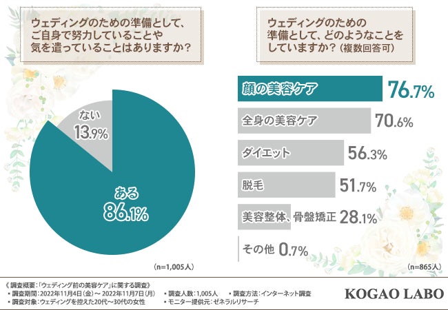 そこで、美容サロン『KOGAO LABO』(https://kogaolabo.net/wp/)は、ウェディングを控えた20代~30代の女性を対象に、「ウェディング前の美容ケア」に関する調査を実施しました。