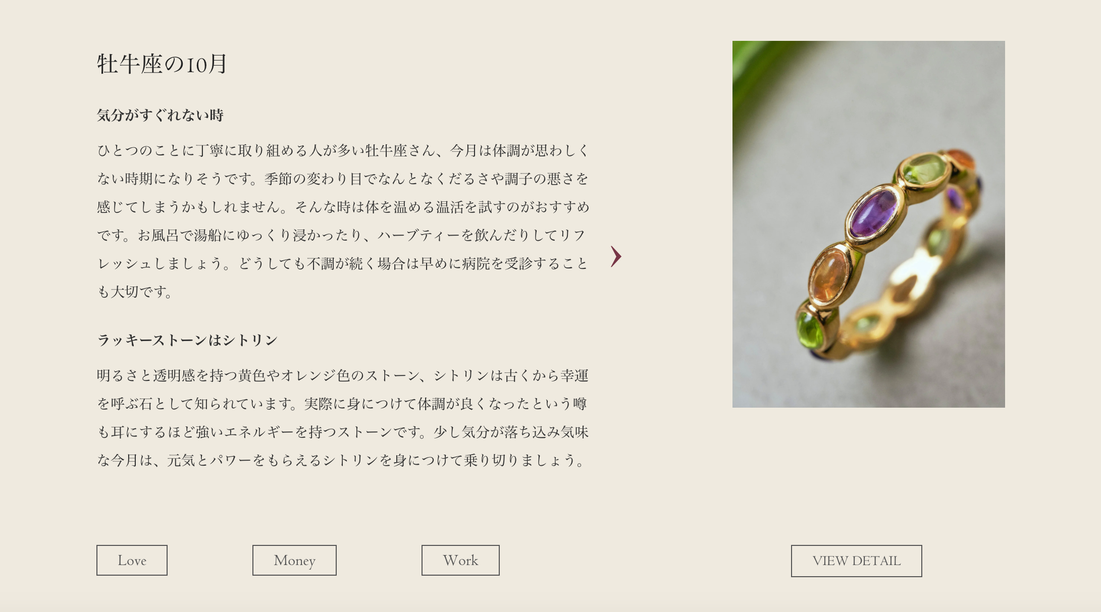 Monthly Gem Horoscopeには、Love(恋愛運)、Money(金運)、Work(仕事運)を毎月配信し、天然石や占い好きが注目する「ラッキーストーン」が、あなたの生活を豊かにしてくれる。