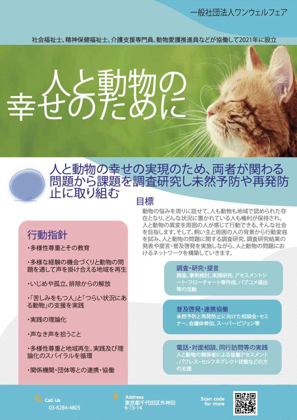 2021年に社会福祉の専門職と動物愛護推進員などが協働して設立した法人です。多頭飼育崩壊をはじめとした動物や環境の問題について、飼い主などの「人」の支援に着目した調査・研究や普及啓発の活動、相談援助を行っております。