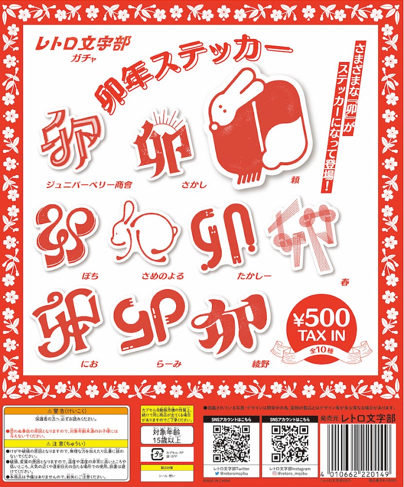 SPINNSの文字をデザインしたステッカーガチャ(全10種)と卯年ステッカーガチャ(全10種)。