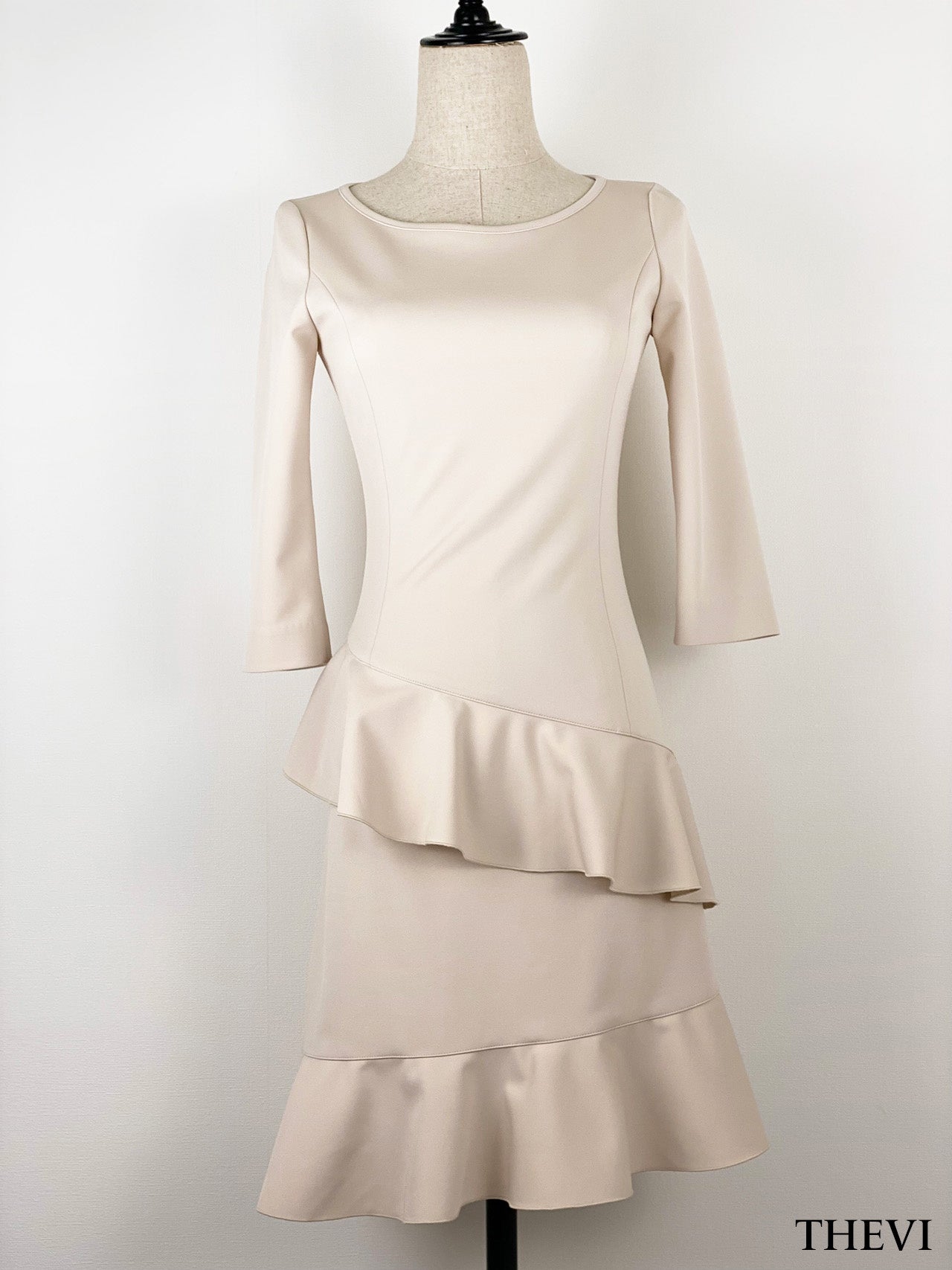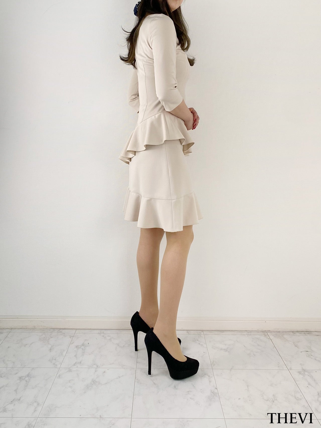 ウエスト位置までは身体のラインに沿うデザインになっているため、可愛いだけではない、大人の女性に向けた美シルエットのフリルワンピースです。