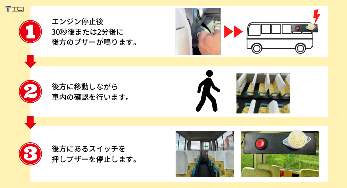 エンジン停止後、車内最後部のブザーが作動。止めに行く際、車内を点検確認で置き去り事故を防止。