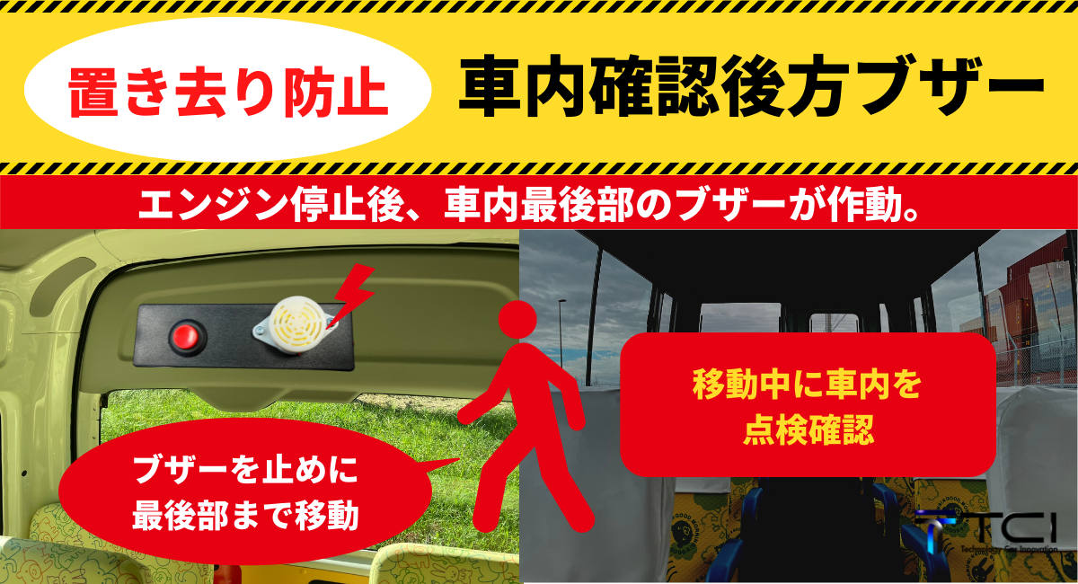 株式会社TCI(本社:大阪市淀川区、代表取締役:尾﨑俊行、以下「TCI」)はTCI独自で開発をした通園バスの置き去り防止システムとして「車内確認用後方ブザー」(品番:SOS-0005)を2022年10月3日(月)に発売します。エンジン停止後、車内後部で警報ブザーが鳴り、運転手らが後部まで行って止める際に、車内に子どもが取り残されていないか確認できるという仕組みです。