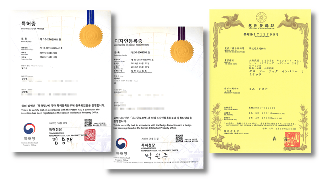 ZERO G ball∠15の画期的なアイデアは韓国で特許を取得しています。また人間工学に基づいたスマートで使いやすいデザインは韓国及び日本でも意匠登録を取得済み。米国、中国、インドネシア、ベトナム、EU、インド、トルコ、タイに特許や意匠登録を出願し、EUとトルコで意匠登録を取得しました。
