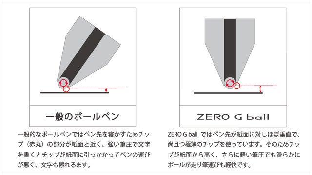 ZERO G ball∠15ではボールを囲むチップを極限まで薄くし、尚且つペン先をほぼ垂直に立てることでチップが紙面に引っかかるリスクを大幅に軽減しました。スラスラとした滑らかな筆の走りに、きっとご満足して頂けます。