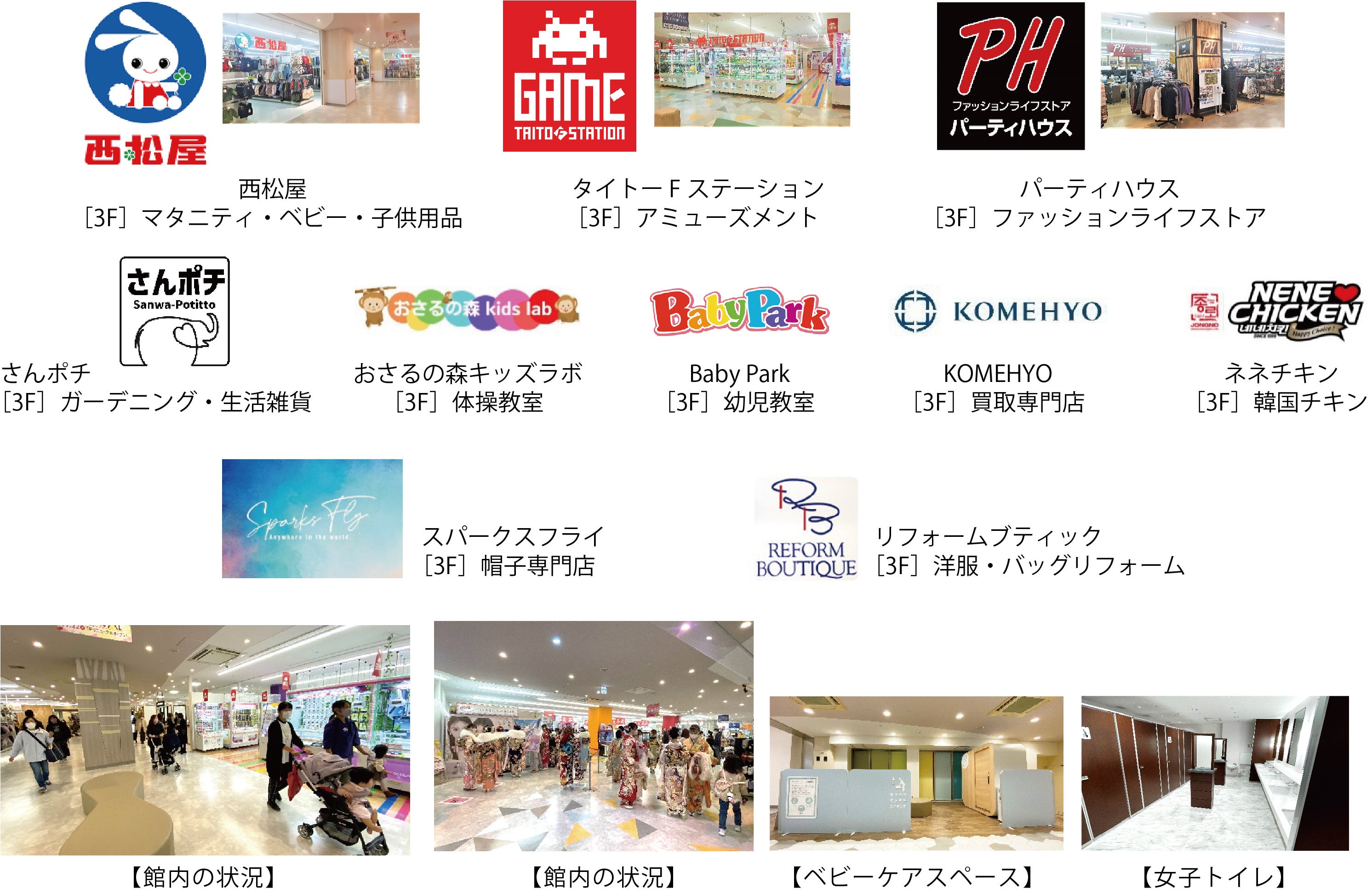 「ベビー、キッズ、マタニティ用品」「大型総合衣料品店」等、ライフスタイルに合わせた店舗が3階フロアに集結し先行オープン。環境面においては、ベビーカーも利用しやすいようフロア内通行導線を拡大。