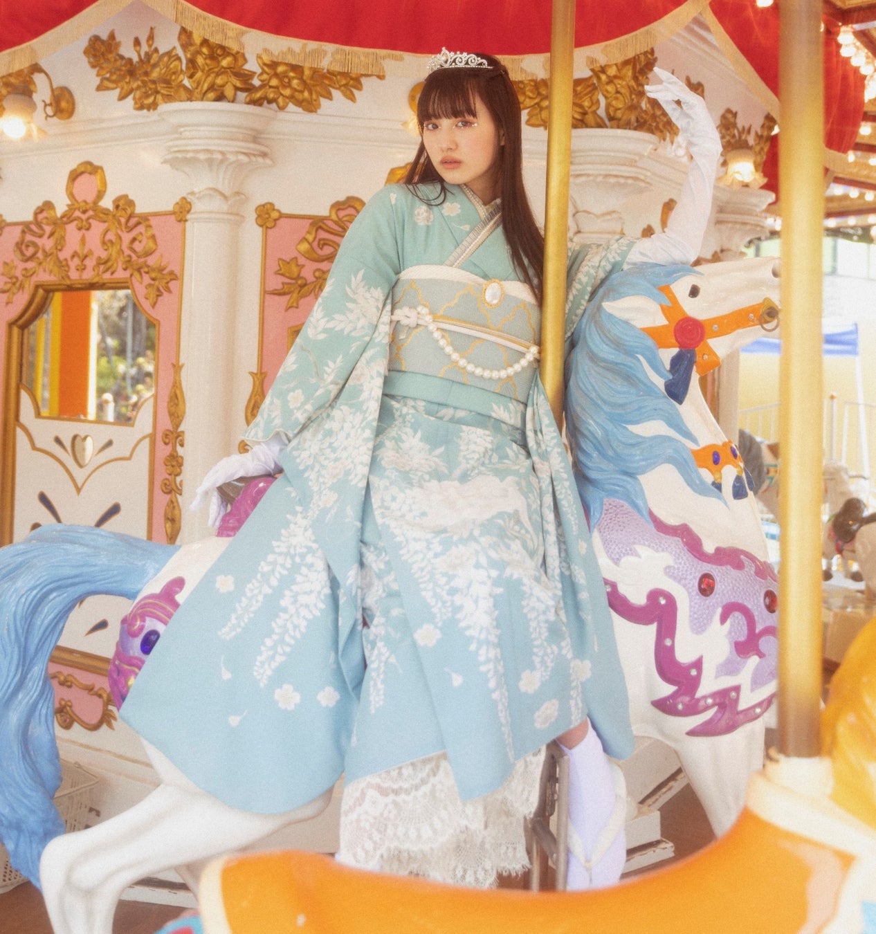 ①頭にはティアラ、首まわりにはタックリボンをあしらい、座ると足元からレースが見える洋装仕立ての長襦袢、着物の柄は純和風ながらもポーセリンアートを思わせる色合いや雰囲気が漂います。帯柄は流行のモロッカン柄を金糸で表現。帯留はブローチ風、帯飾りはパールをネックレスのように掛け、真っ白なシルクのグローブで仕上げて。