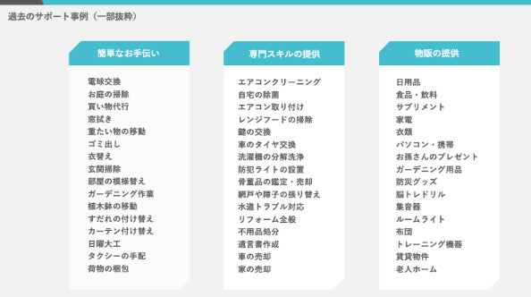 電球交換、ゴミ捨て、買い物代行、おでかけ同行など、20分1,000円〜で依頼可能となっています。