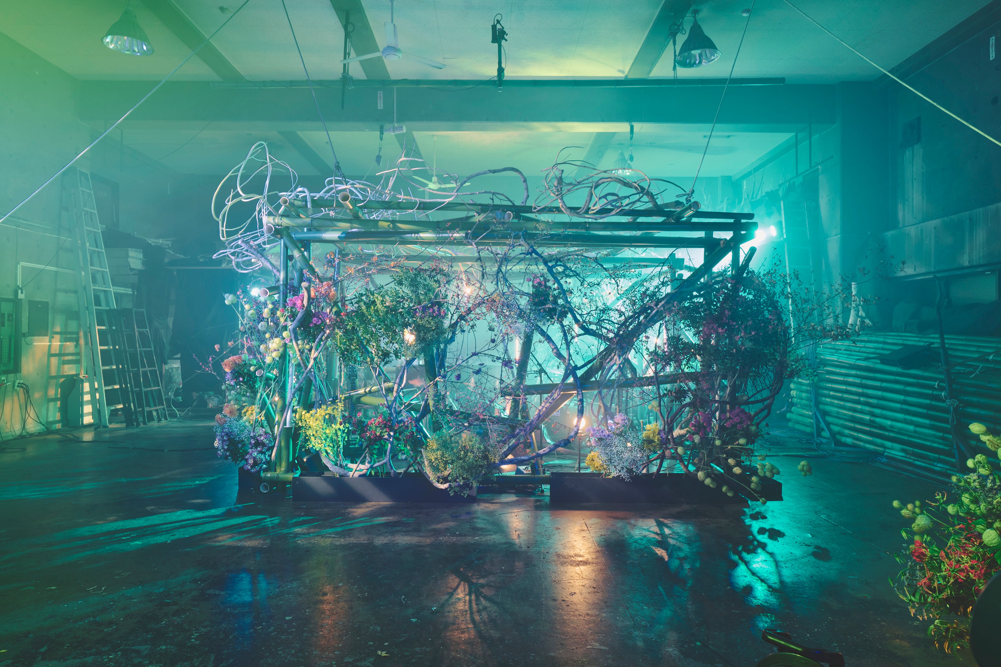 本公演は2020年世田谷区芸術アワード音楽部門を受賞し、今回は平原慎士が演出と作曲を手掛け、「混沌とする世界の犠牲になった人々へ花を手向ける」という想いのもと、一般公開されていない草月流の都内アトリエにて行なわれました。普段は花材が広げられているアトリエの雰囲気が漂い、会場中央には照明に灯されたステージが客席に囲まれました。90分をかけて会場全体を巻き込んだ圧巻のパフォーマンスに観客は歓声を上げて盛り上がりました。