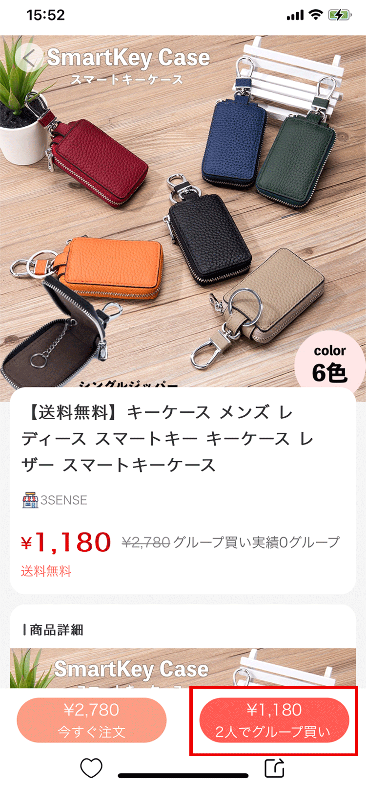 決定的な違いの一つ目は、「グループ購入」機能です。商品には一人で購入する通常購入の場合の金額と、グループを作ってグループで購入するグループ購入金額が表示されています。グループ購入した場合、格安金額で購入できます。 次にグループを作る際にSNSシェアによって商品を拡散して、グループのメンバー募集をします。メンバーがグループ形成の目標人数に達成すれば、そのグループを形成した全員が格安価格で商品を購入することができます。