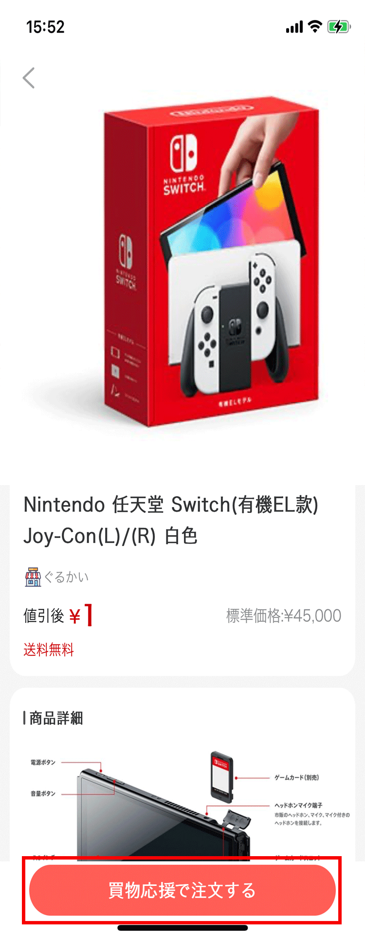 決定的な違いの二つ目は、「買物応援」機能です。この買物応援機能というのは、アプリの商品カテゴリの中に 「買物応援」というカテゴリがあります。そのカテゴリにある商品を購入すると、あなたの友達に買物応援を募ります。要するに、買物応援というのは友達に買い物のお手伝いをしてもらうということでクリックを募ります。目標金額が表示されていて、通常単価から買物応援(クリック)されるたびに金額が減っていき、目標金額に達成するとその金額で購入が可能です。
