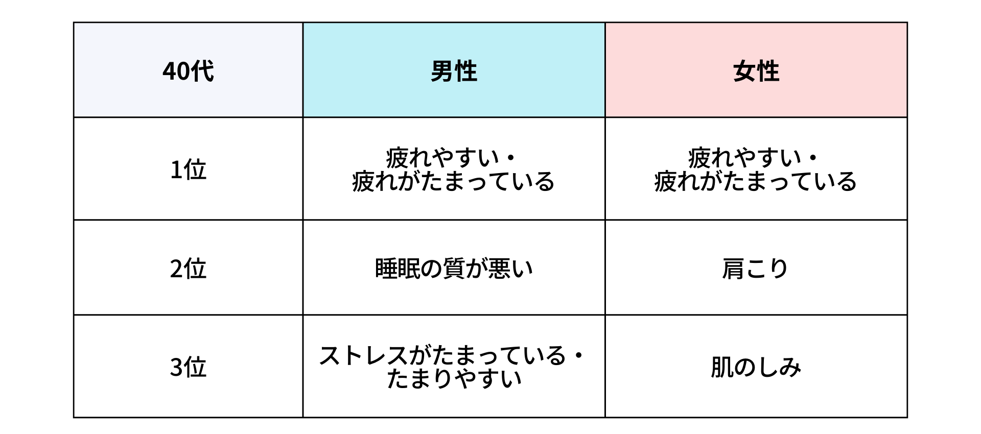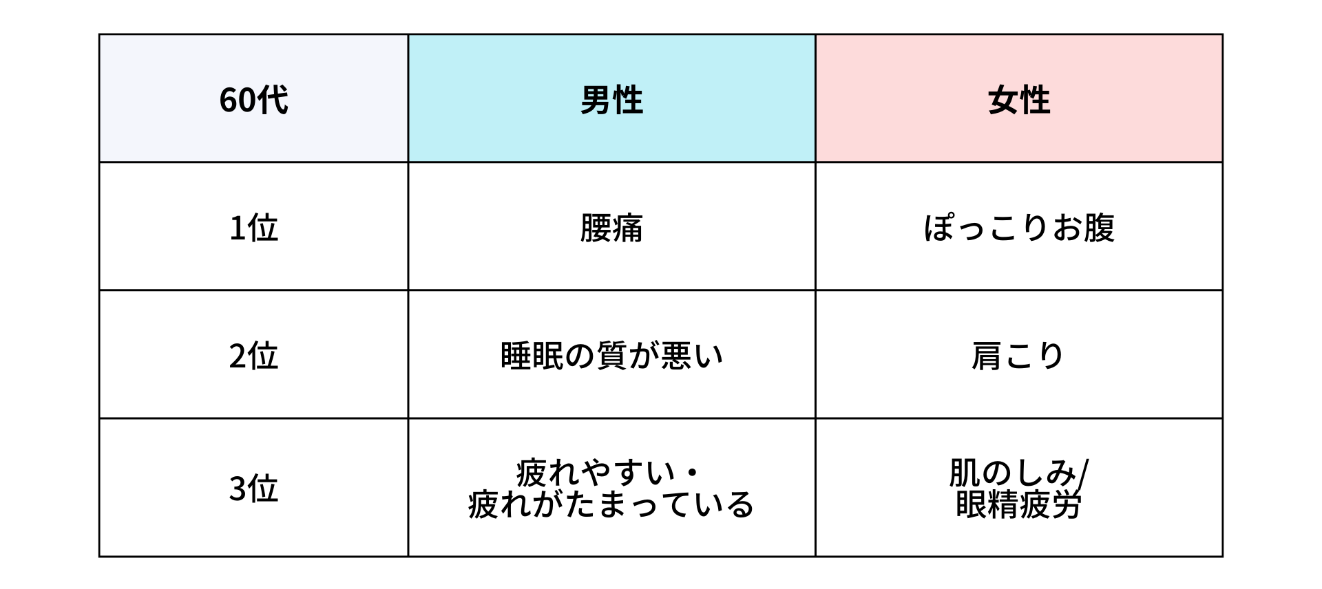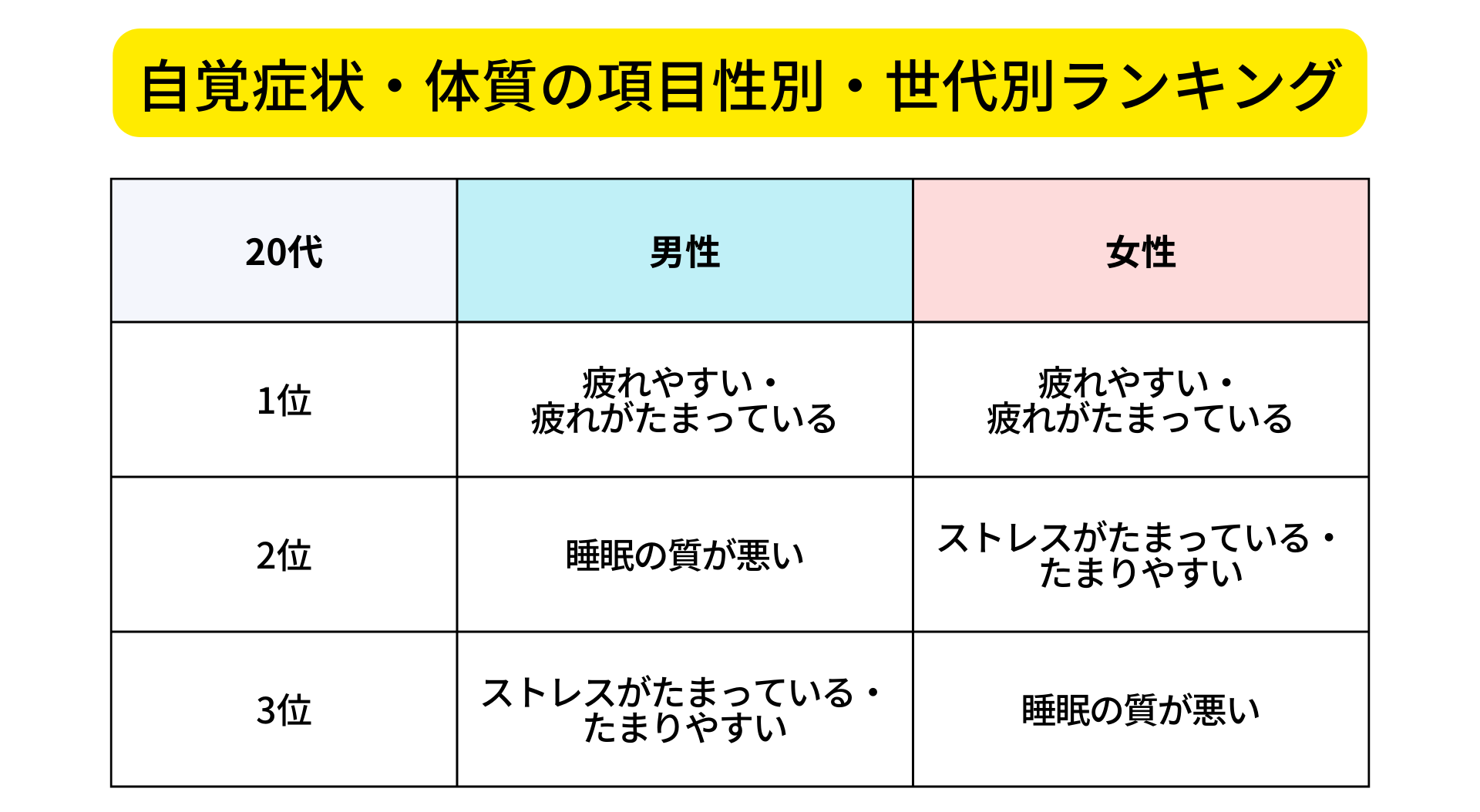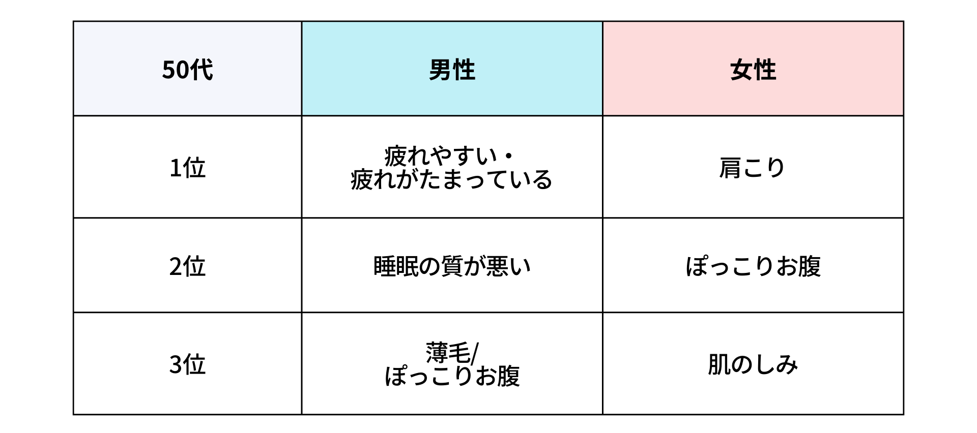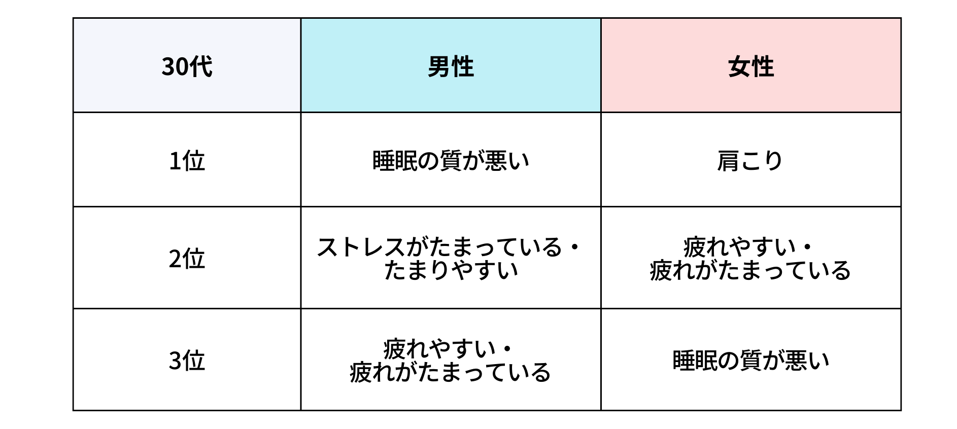 女性では「肩こり」への不調を意識される回答が多かったのが特徴です。これは、女性ホルモンや男性に比べ筋肉量が少ないことが原因のため、上位にきていると推測されます。