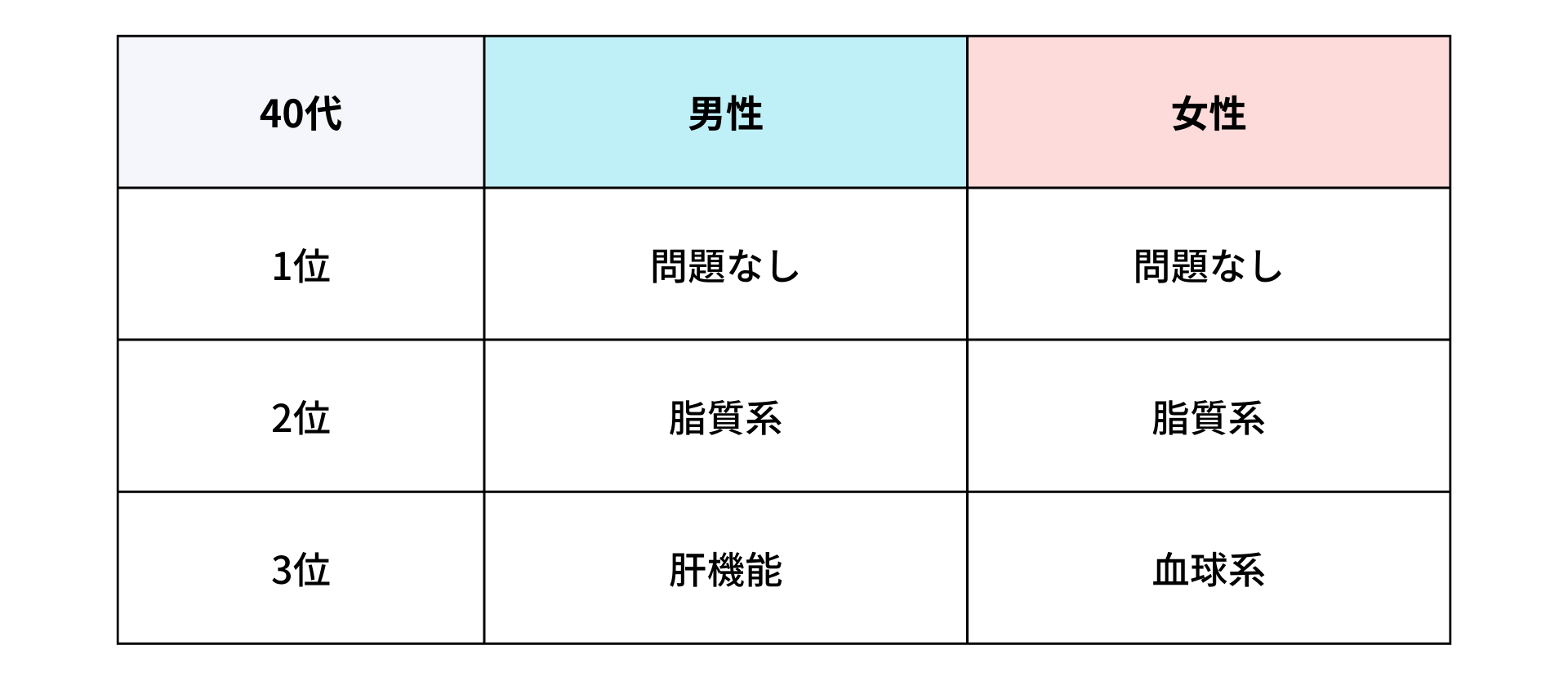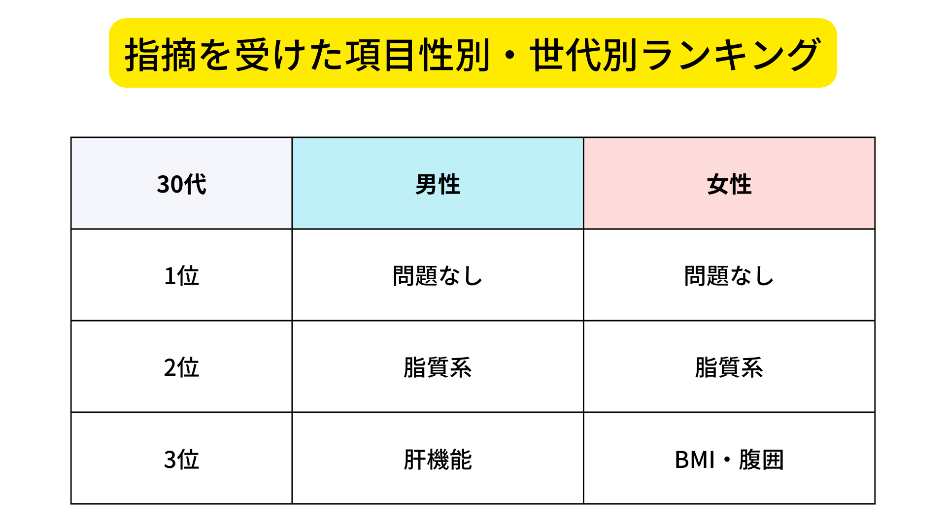 また、30~40代の男性の中で「肝機能」が上位にきました。アルコール摂取の機会が多い世代のため、肝機能値がこの世代で上がってきたと考えられます。