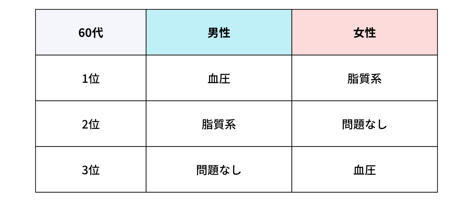 50代以上になると、「血圧」の項目で指摘される方が増えてきます。これは、加齢に伴い、血管の弾力性の低下などにより収縮期血圧があがることがわかっています。そのため、50代以上になると、「血圧」が上位にあがってきています。