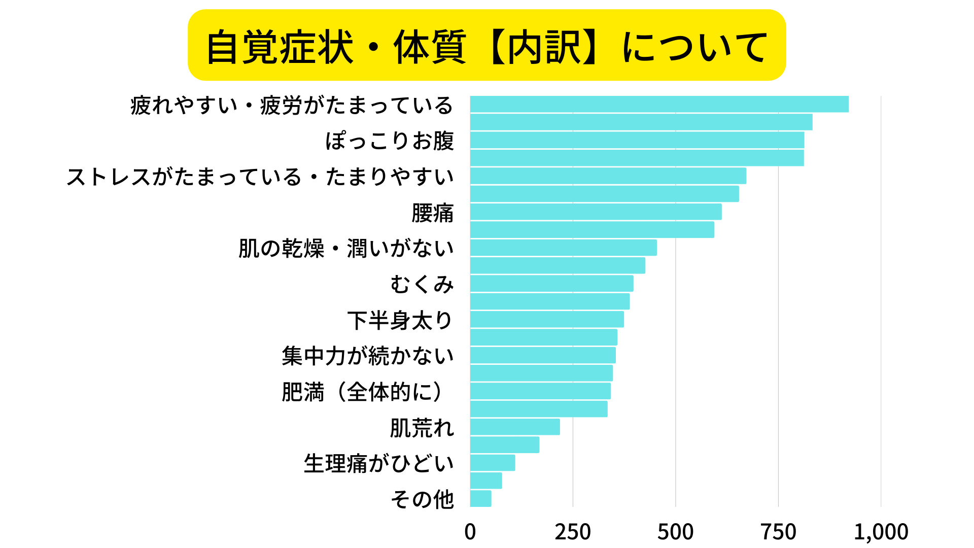 今回のアンケートの結果から、半数近くが健康診断の際に指摘を受けたことがあり、多くの人が自覚症状・体質として何かしら健康に対し悩みがあることの結果となりました。