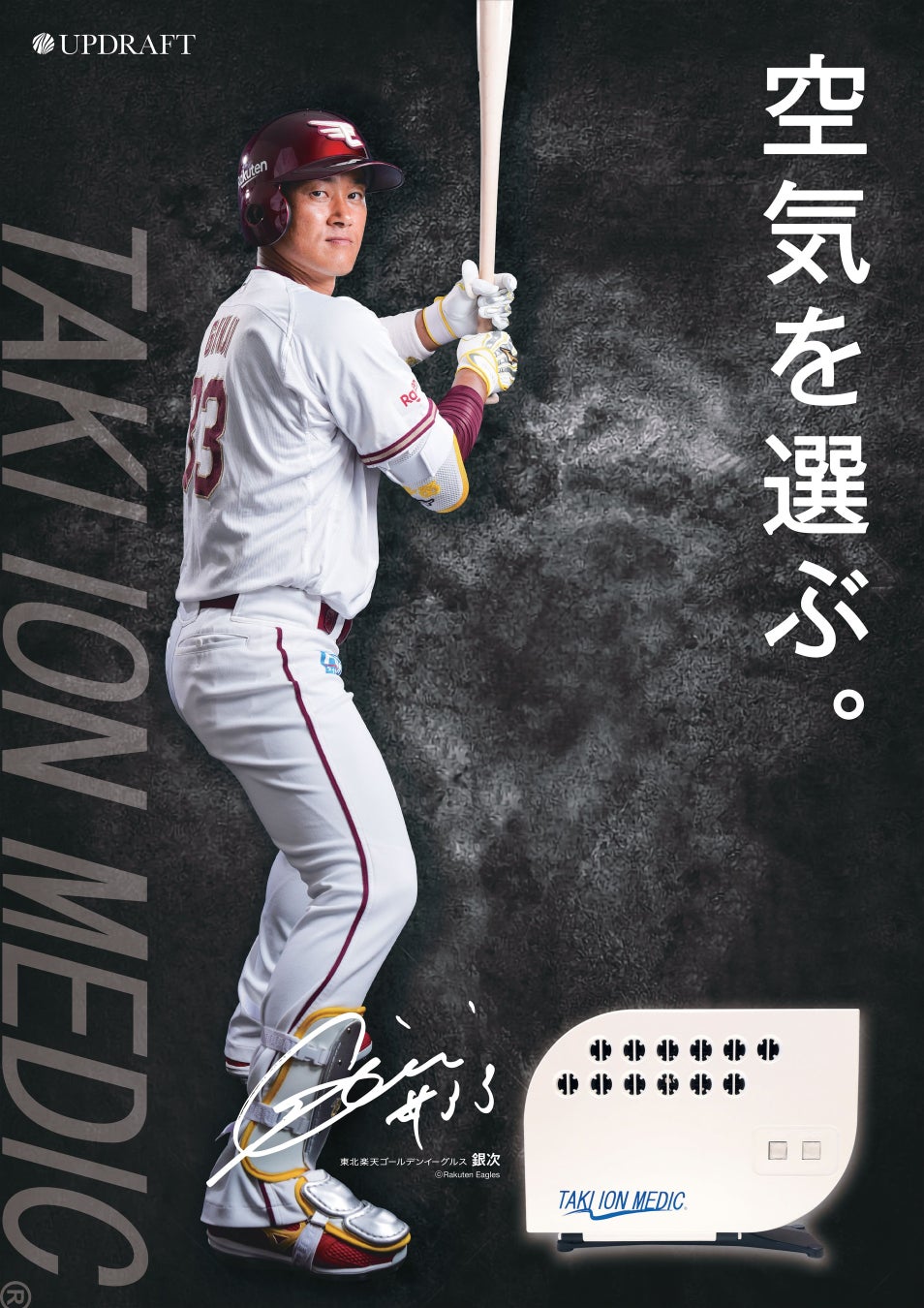 株式会社アップドラフト(本社:宮城県仙台市、代表取締役:松野雅樹、以下当社)は当社製品「マイナスイオン生成器 TAKI ION MEDIC」のイメージキャラクターに「東北楽天ゴールデンイーグルス(以下:楽天イーグルス)銀次選手」の継続が決定したことをお知らせします。