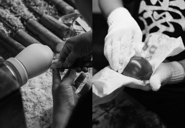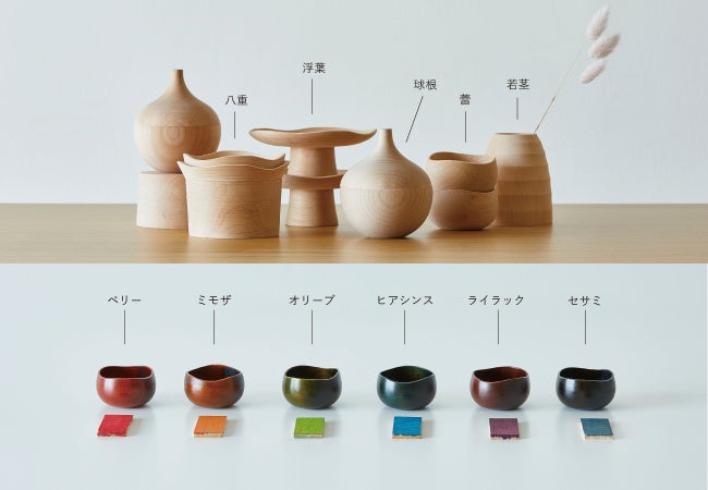 ろくろ挽き=木目模様を生かした自然な風合いが魅力の山中塗。本商品では、植物のようなフォルムに近づけるため、回転ろくろや旋盤のほか、最後は手彫りで木地を整え、花のような曲線や球根の芽吹きを表現しました。