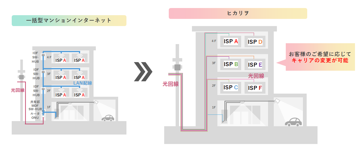 当社が手掛ける「ヒカリヲ」はこれらの問題を解決すべく、光回線を全ての部屋に公平に直接配線する「光配線方式」を採用し、かつ複数の光回線サービスの中から自由に選べる「マルチキャリア方式」を可能とするこれまでにない新しい光回線サービスとなっております。全戸はあらかじめ光配線を実装しているため、入居後に好みに応じた光回線サービスも利用可能となります。