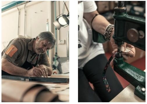 Lyrssのバッグは、このアトリエを通じて入手した、市場でも新しいエシカルレザーを使用。数々の有名メゾンブランドのバッグを手がけるモデリスタと共に、コロナ禍の困難の中、通常の3倍の歳月をかけて作成。全て手作業で作られています。昨今、イタリアのバッグ産業も、生産者の高齢化、コロナ禍でのオーダー減、営業停止措置が何度となく繰り返され、廃業に追い込まれるファクトリーが後を絶ちません。