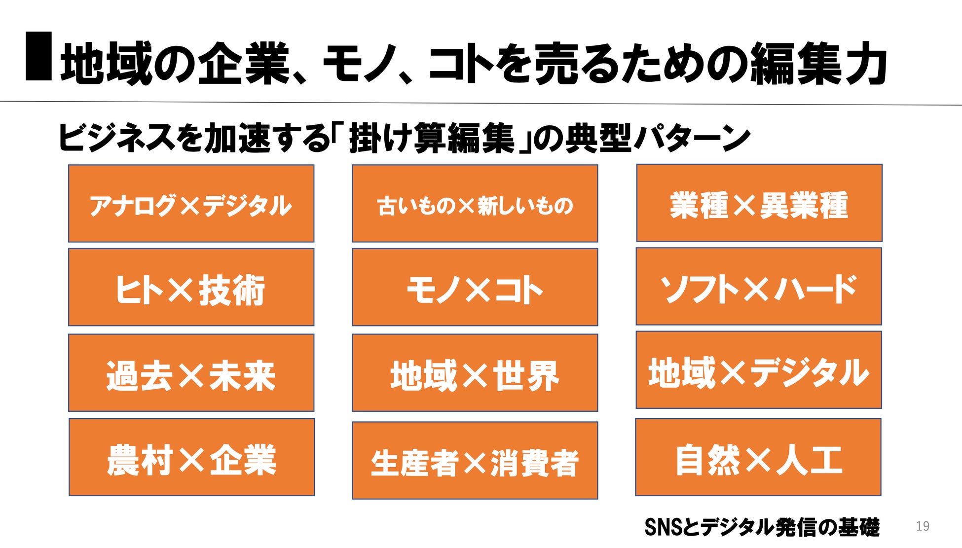 自社の商品やサービス、地域に眠る豊富な素材を顧客視点で「再編集」「加工」して発信力を高めていくことも必要です。地元や自社の魅力を積極的に発信し、地域経済を盛り上げていきましょう!