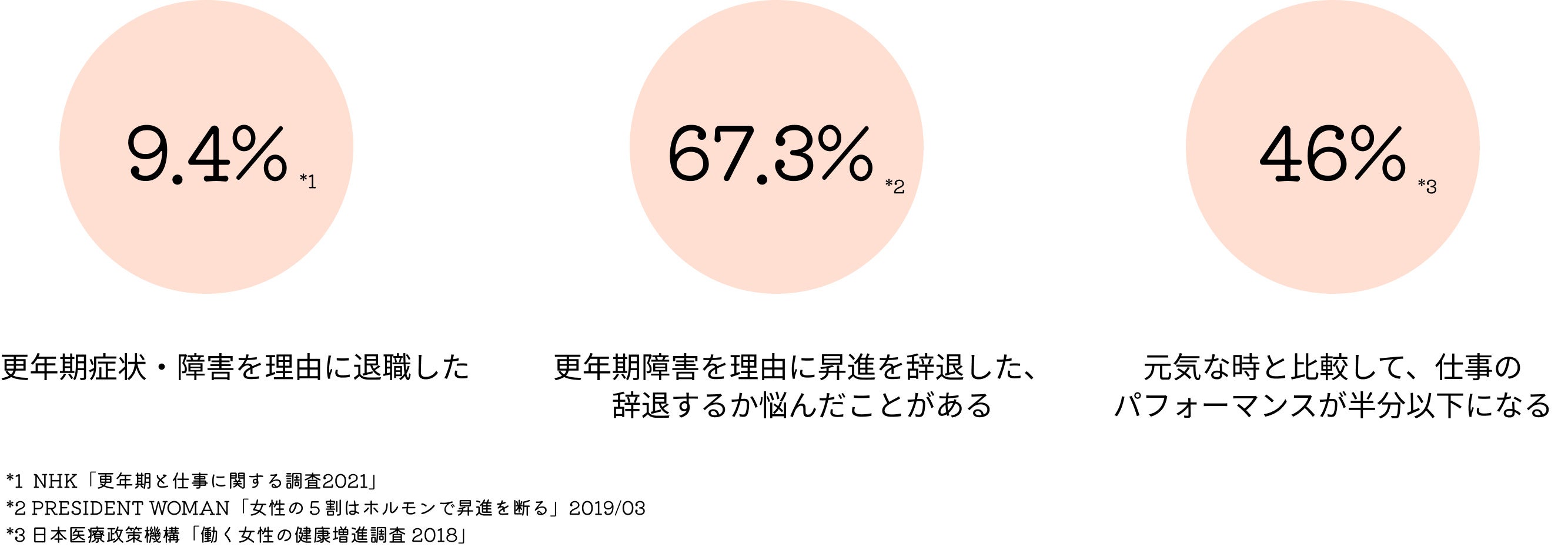 働く女性およそ3,000万人のうち、45歳から54歳までの「更年期世代」は約4分の1。現在、36歳から55歳までの女性の約半数以上が何らかの更年期症状を抱えていて*3、40〜50代女性の約9.4%が更年期症状/障害を理由に退職*4しているというデータがあります。その経済的損失は約4,200億円*4にも上るとされています。女性ホルモン関連の不調をはじめとして、更年期など女性特有の健康課題が現れてくる40〜50代は、女性にとってちょうどキャリアアップの重要な時期に重なります。女性が男性と同等に長く働く制度や環境は整備が進んでいる一方で、更年期症状によって女性が自己実現を断念してしまうことがあるのです。