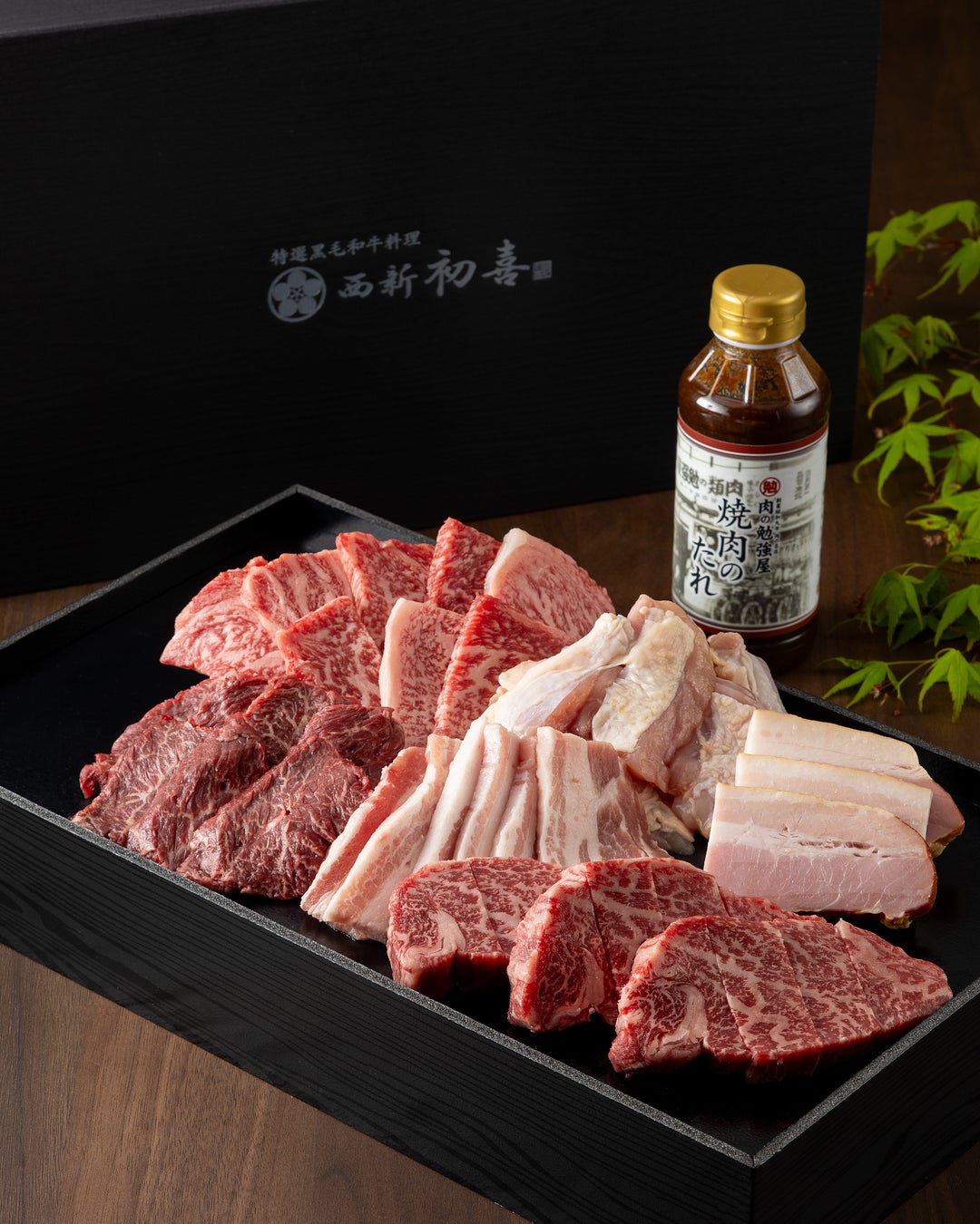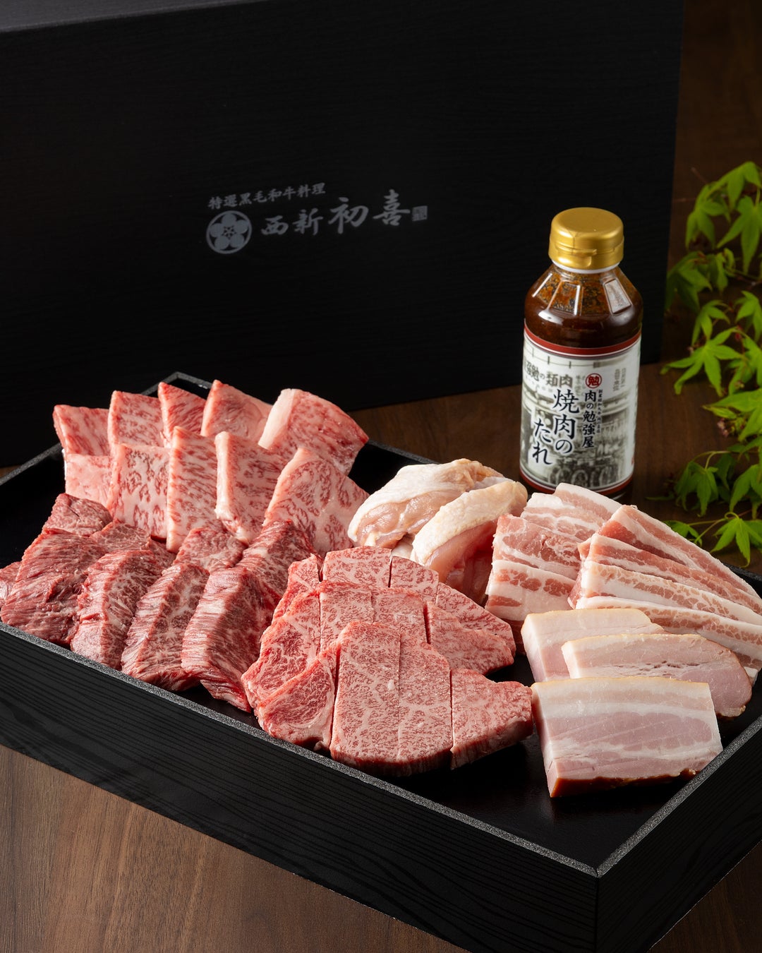 西新初喜の“技と目利き”を存分に味わえる、贅沢なプレミアムセット。 特選ロースや特選ヒレ、和牛ハラミをはじめ、豚・鶏・ベーコンなど、異なる旨みを楽しめるよう丁寧に構成しました。