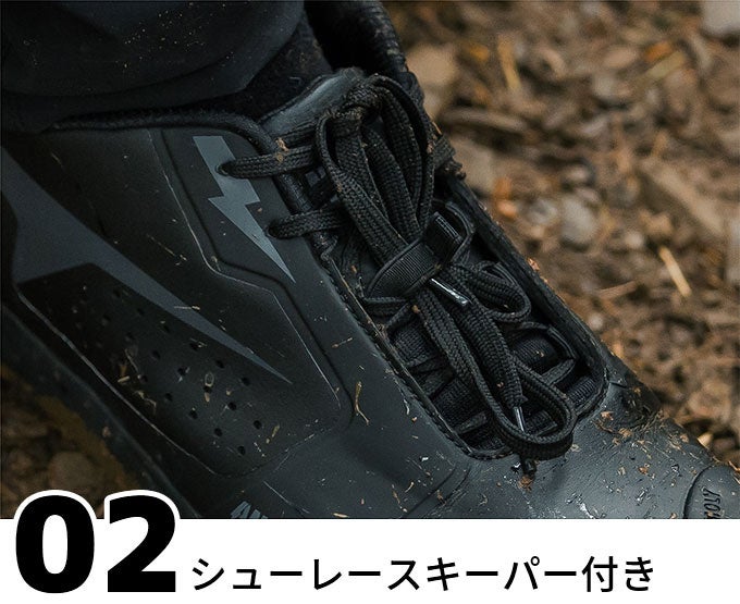 靴ひもの両脇に防護壁を作成。石や枝との接触や泥汚れから靴ひもを保護します。