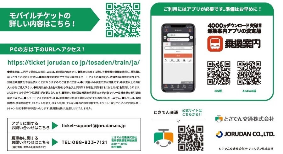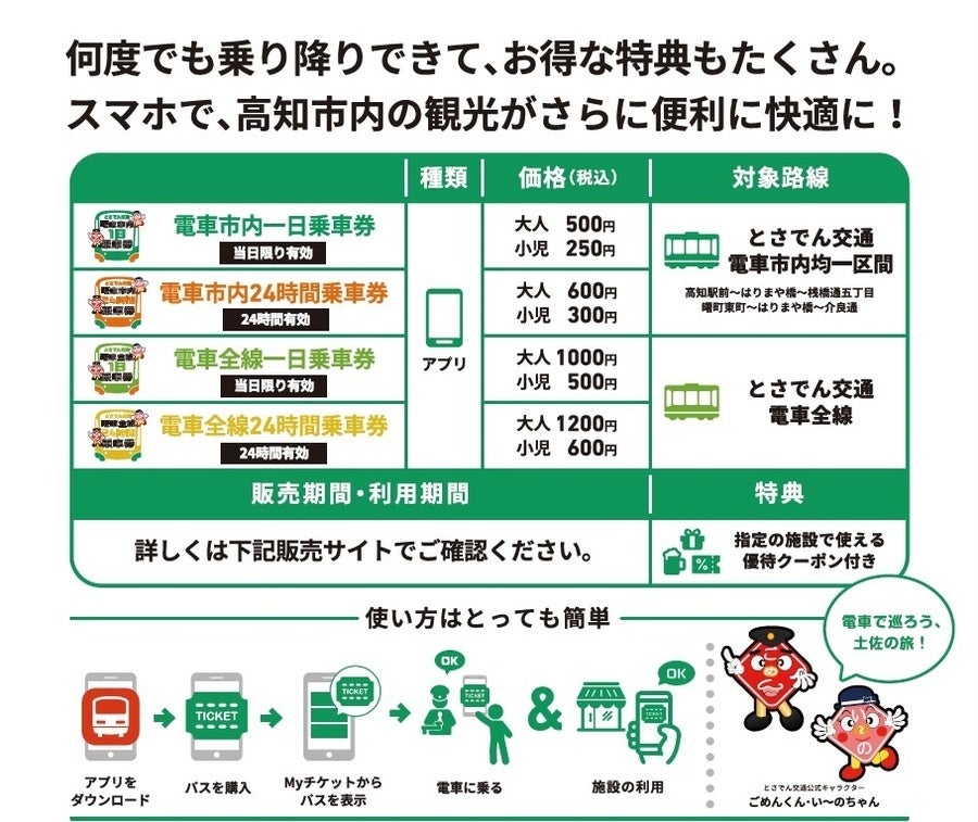 ◎モバイル版 電車一日乗車券、電車24時間乗車券:https://www.tosaden.co.jp/info/dtl.php?ID=1875