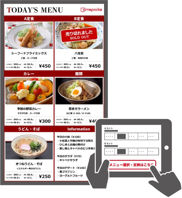 ・「売り切れ」や「残りわずか」など今伝えたい情報や、代替メニューへの切替えもタイムリーに更新できます。