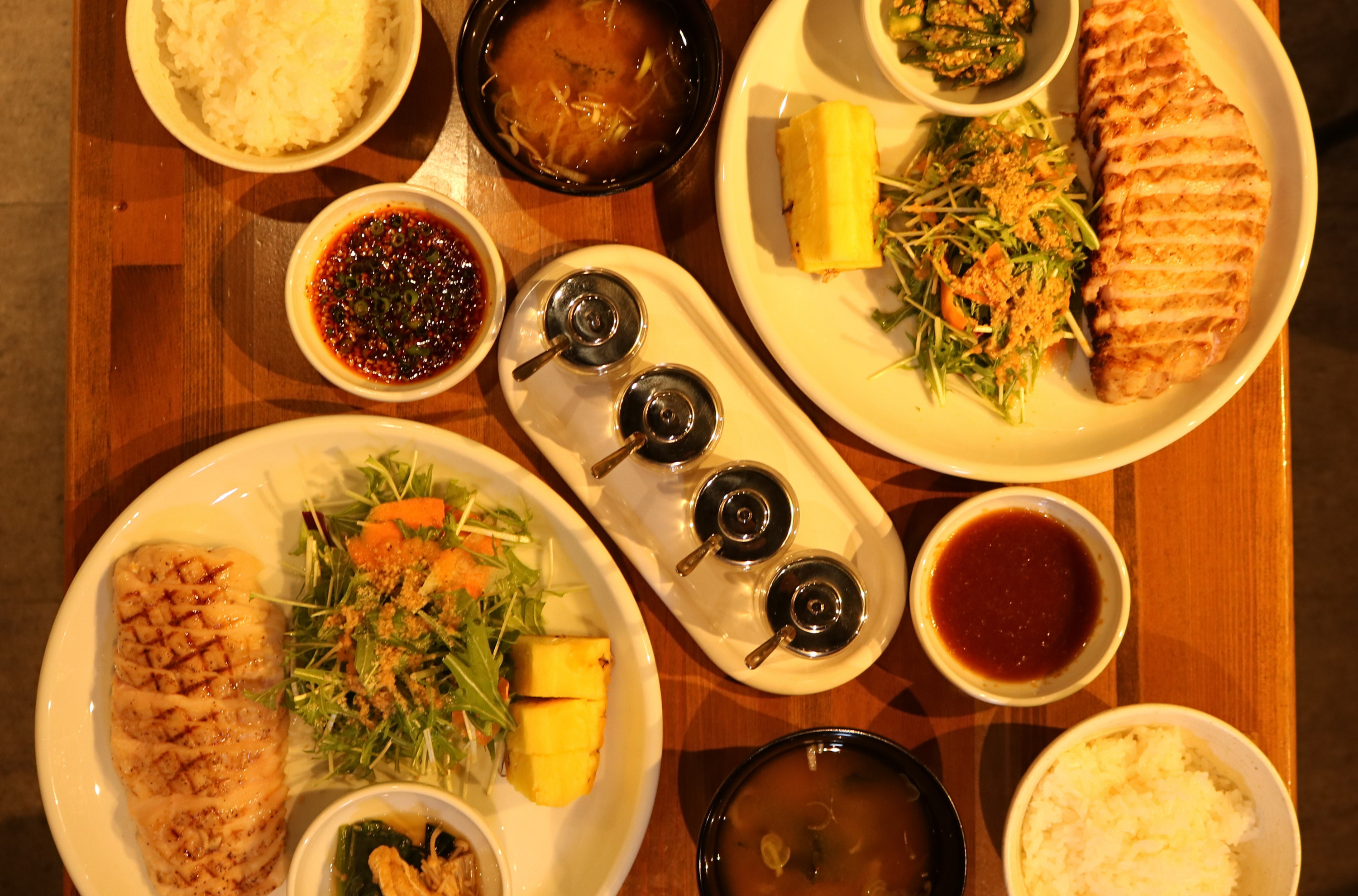 栄養定食の基本セットは、メイン肉料理、ご飯、味噌汁、サラダ、パイナップル。このシンプルでバランスの取れた構成に、お好きな小鉢を追加して、自分好みの定食にカスタマイズできます。