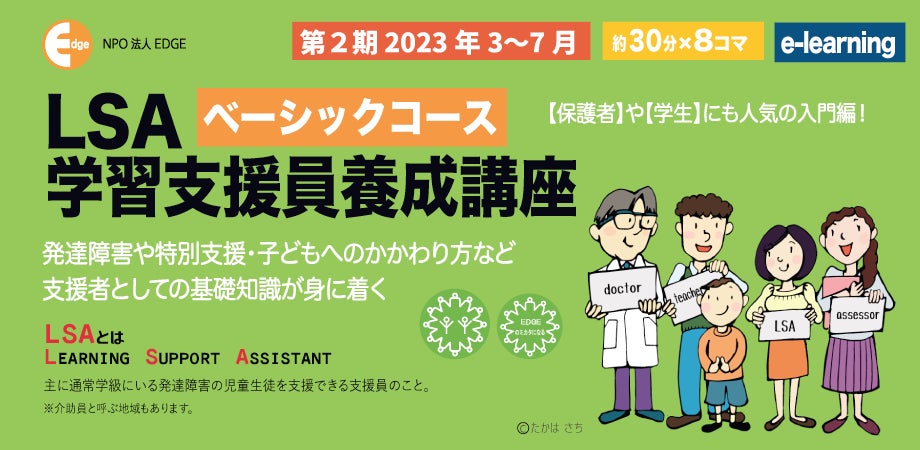 東京都港区の認定NPO法人エッジ(会長:藤堂栄子)は、発達障害や特別支援・子どものかかわり方など、学習支援者としての基礎知識が身につく、学習支援員(LSA)養成講座ベーシックコースを2023年3月に開講します。