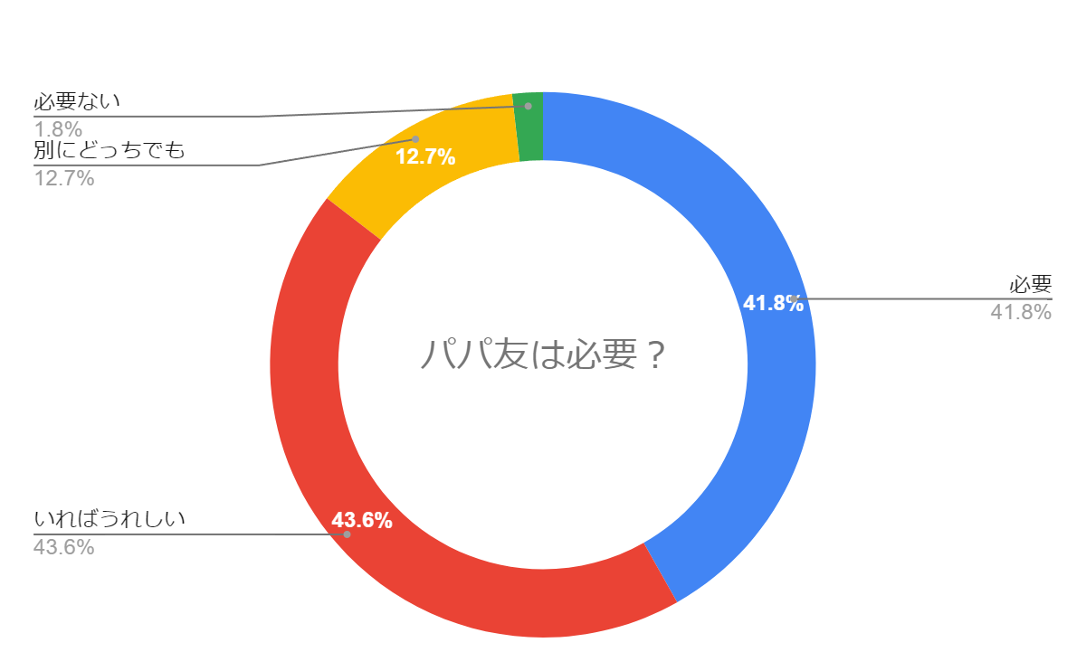 一般的に「女性は共感を求める」と言われますが、8割以上のパパがパパ友を求めている回答から男性も子育てをするにあたって、共感してくれる仲間を必要としている傾向が伺えます。