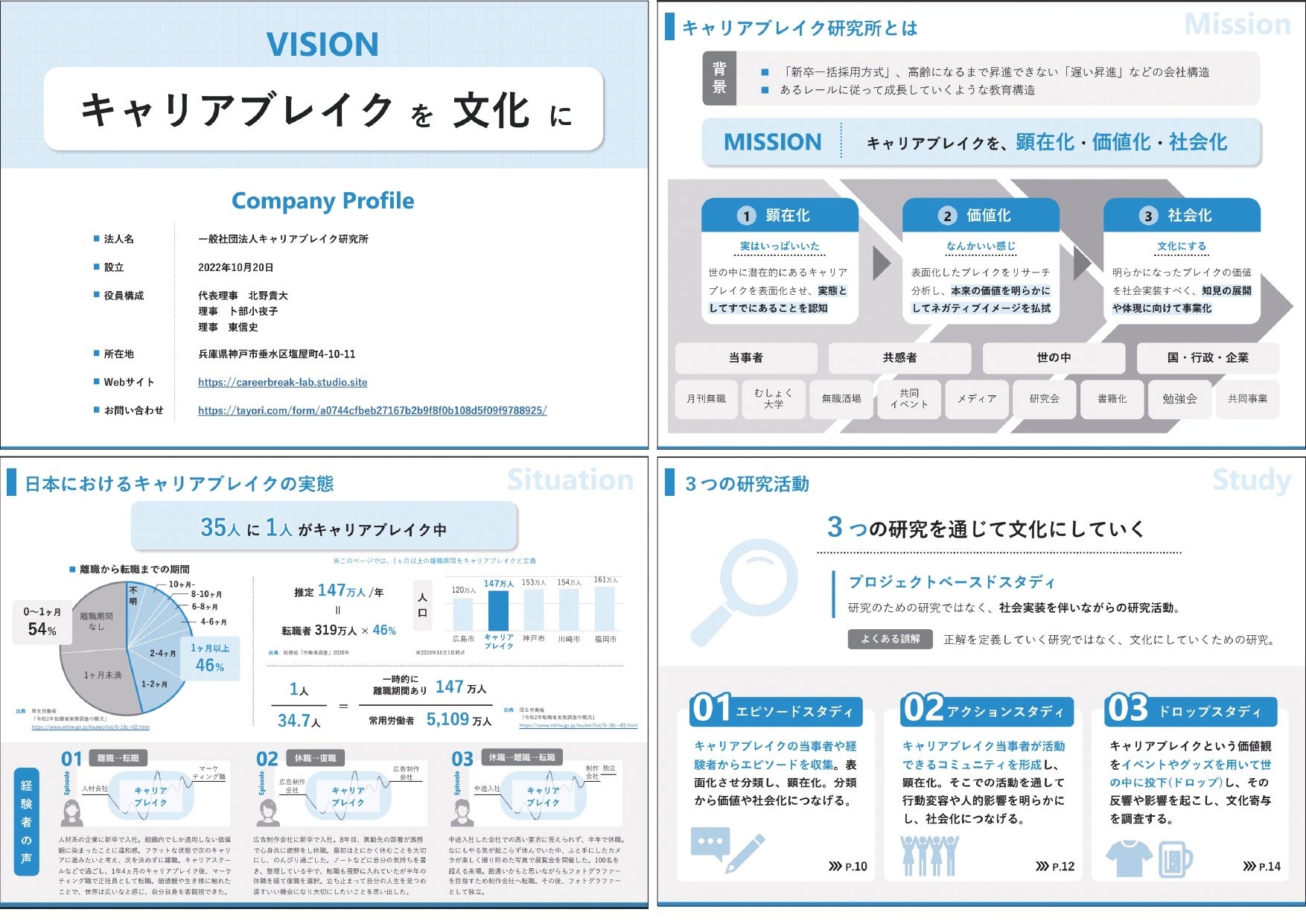 利害関係者や支援者を含め興味を持って頂いている方へ、同研究所が何を研究し、どんなことを目指しているのかを改めてお伝えするため、この度アニュアルレポートを発刊することとなりました。具体的な研究活動や成果、社会にどのようなインパクトを残しているのかの明文化、また今後目指すかたちとそのために必要なアクションについて構造化して記載しています。キャリアブレイクという概念の研究・発信とは何なのか、設立から1年を経た同研究所の法人としての進捗について報告するレポートとなっています。