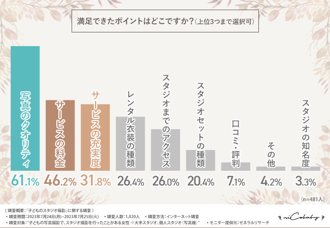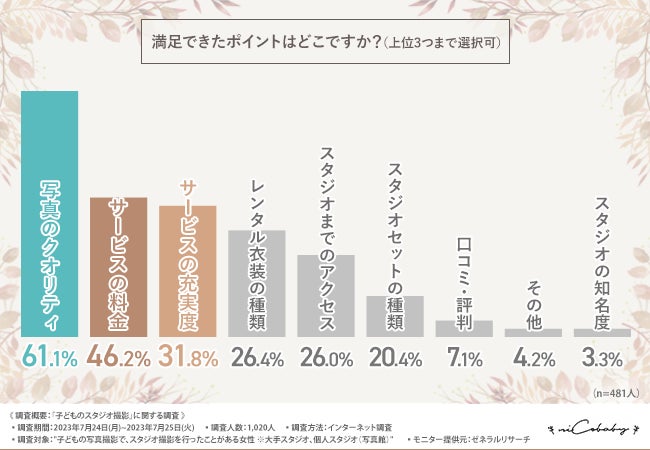 「満足できたポイントはどこですか?(上位3つまで選択可)」と質問したところ『写真のクオリティ(61.1%)』と回答した方が最も多く、次いで『サービスの料金(46.2%)』『サービスの充実度(31.8%)』『レンタル衣装の種類(26.4%)』『スタジオまでのアクセス(26.0%)』と続きました。