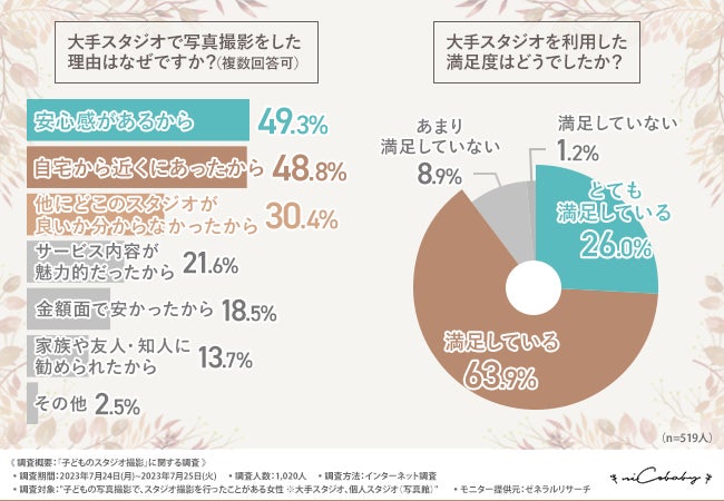 「大手スタジオで写真撮影をした理由はなぜですか?(複数回答可)」と質問したところ『安心感があるから(49.3%)』と回答した方が最も多く、次いで『自宅から近くにあったから(48.8%)』『他にどこのスタジオが良いか分からなかったから(30.4%)』『サービス内容が魅力的だったから(21.6%)』『金額面で安かったから(18.5%)』と続きました。