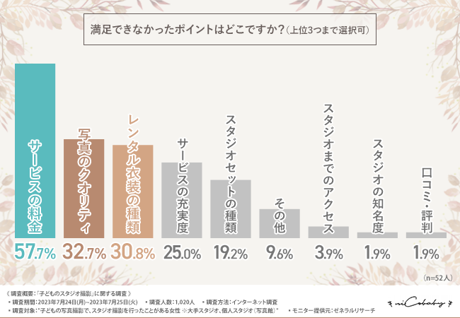 「満足できなかったポイントはどこですか?(上位3つまで選択可)」と質問したところ『サービスの料金(57.7%)』と回答した方が最も多く、次いで『写真のクオリティ(32.7%)』『レンタル衣装の種類(30.8%)』『サービスの充実度(25.0%)』『スタジオセットの種類(19.2%)』と続きました。