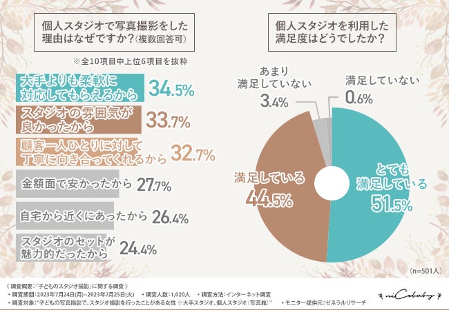 「個人スタジオで写真撮影をした理由はなぜですか?(複数回答可)」と質問したところ『大手よりも柔軟に対応してもらえるから(34.5%)』と回答した方が最も多く、次いで『スタジオの雰囲気が良かったから(33.7%)』『顧客一人ひとりに対して丁寧に向き合ってくれてるから(32.7%)』『金額面で安かったから(27.7%)』『自宅から近くにあったから(26.4%)』と続きました。
